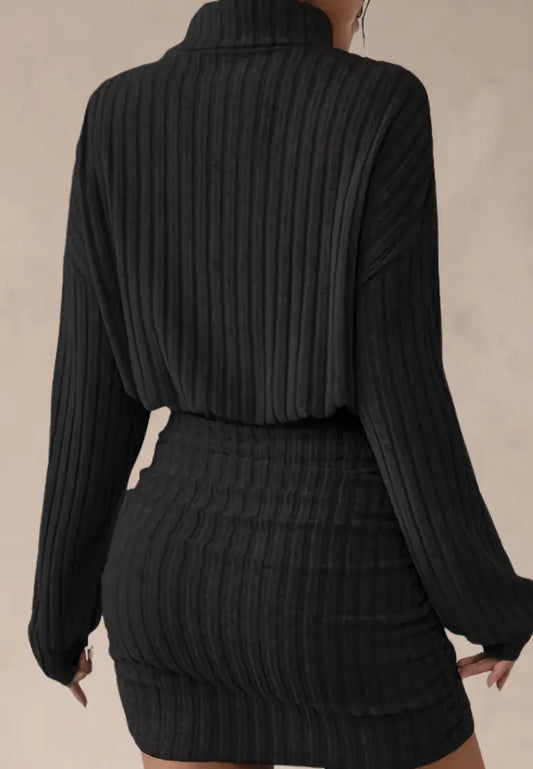 Czarna sukienka prążkowana dzianinowa z golfem i długim rękawem