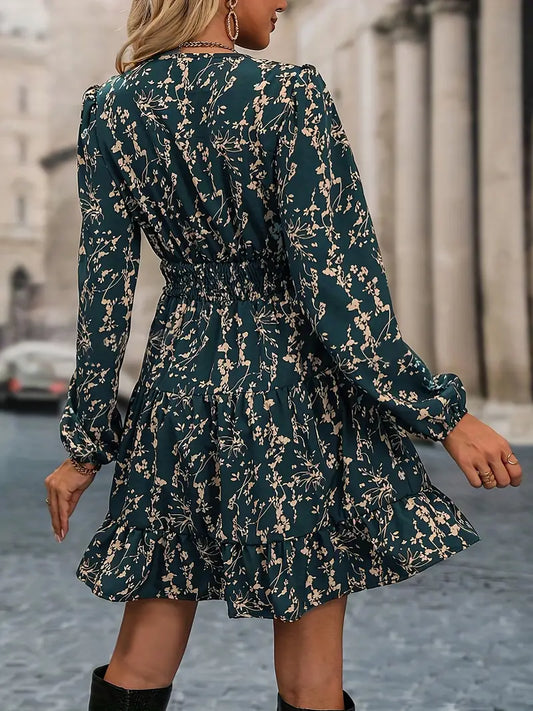 Sukienka w drobne beżowe kwiatuszki z falbanką i marszczeniem zielona