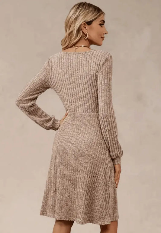 Nowy rok -69%Beżowa sukienka dzianinowa prążkowana z długim rękawem