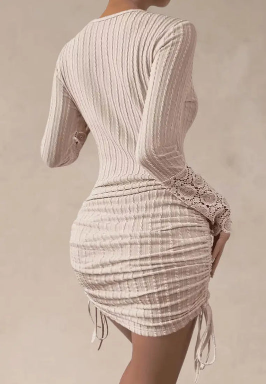 Beżowa sukienka prążkowana dzianinowa z guzikiem i koronką na rękawach