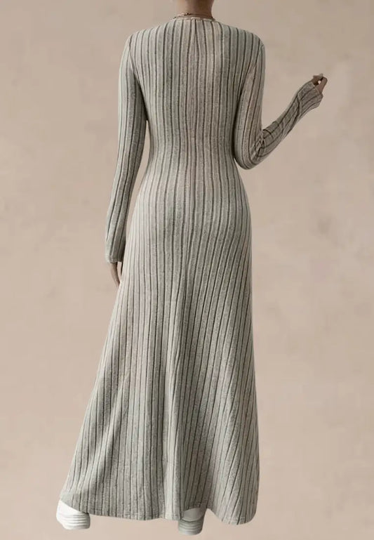 Nowy rok -70%Beżowa sukienka maxi z prążkowanej dzianiny i dekoltem V