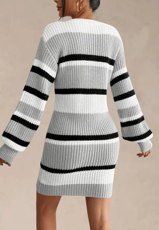 Szara sukienka swetrkowa w czarno-białe paski z długim rękawem