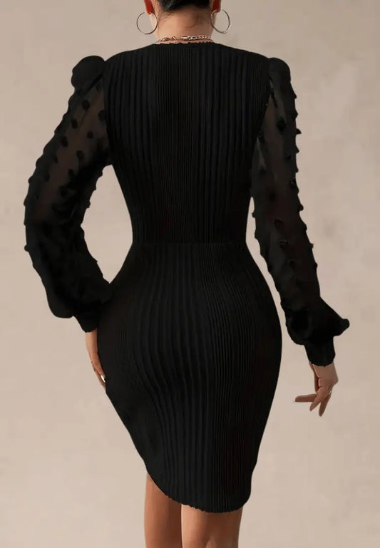 Czarna sukienka z prążkowanej dzianiny i tiulowym rękawem