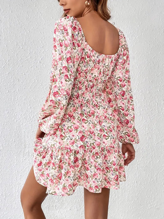 Zwiewna sukienka mini w różane kwiaty z marszczeniem i falbaną