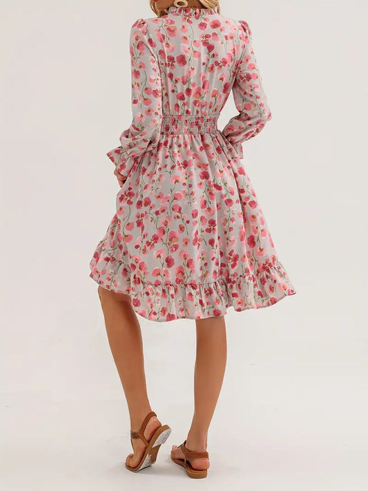 Rozkloszowana sukienka w kwiaty z falbaną i marszczeniem w talii