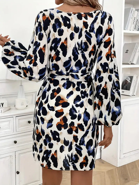 Krótka biała sukienka w czarno-niebiesko-pomarańczowe wzory z paskiem