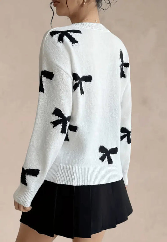 Biały sweter damski z czarnymi kokardkami i okrągłym dekoltem
