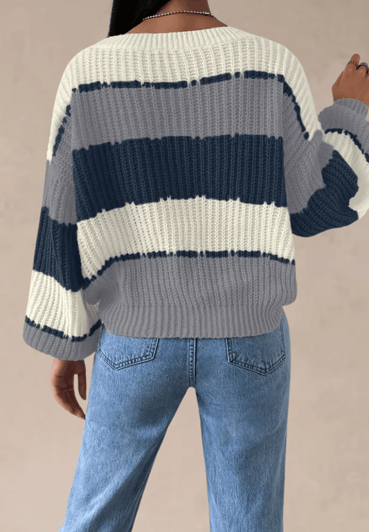 Biało-szary sweter damski w granatowe pasy z okrągłym dekoltem