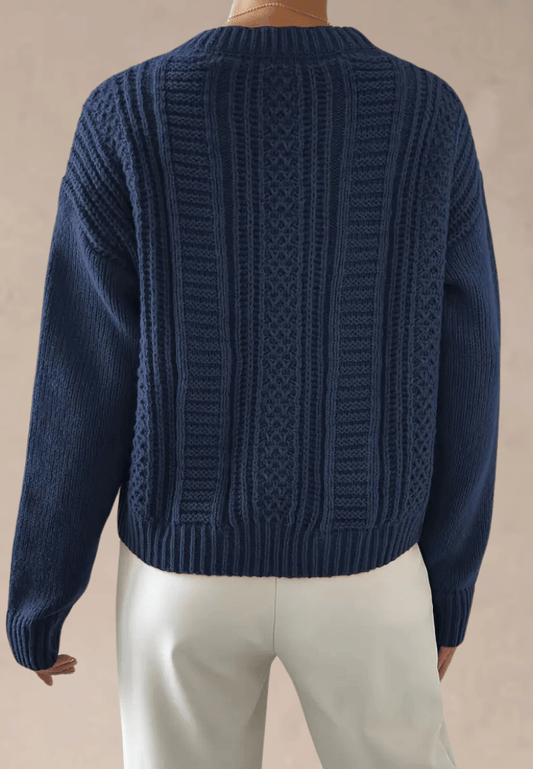 Granatowy sweter damski z grubym splotem i warkoczowym wzorem