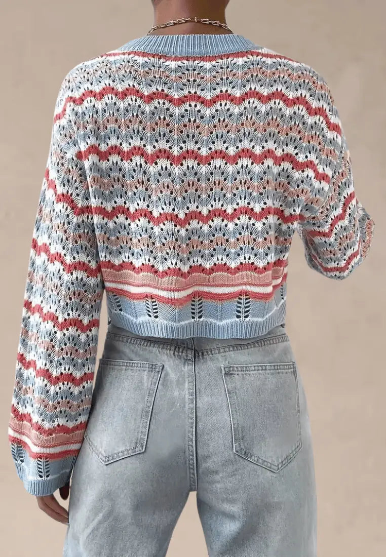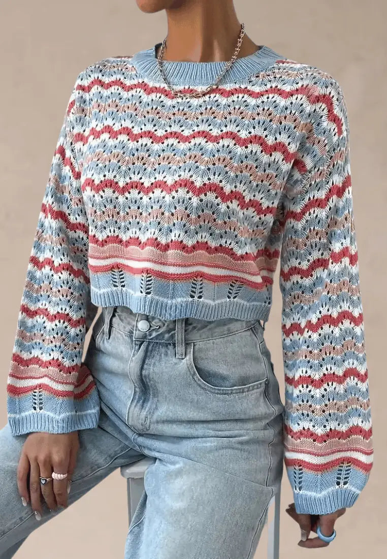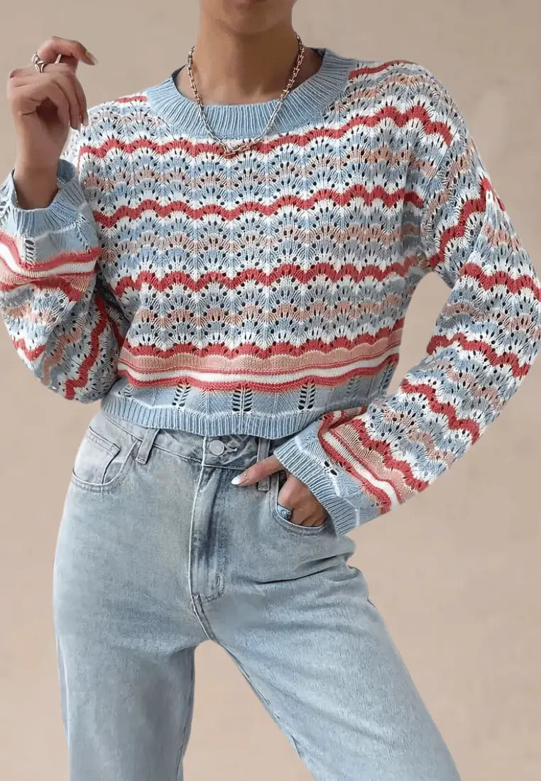Wielokolorowy sweter damski ażurowy z okrągłym dekoltem