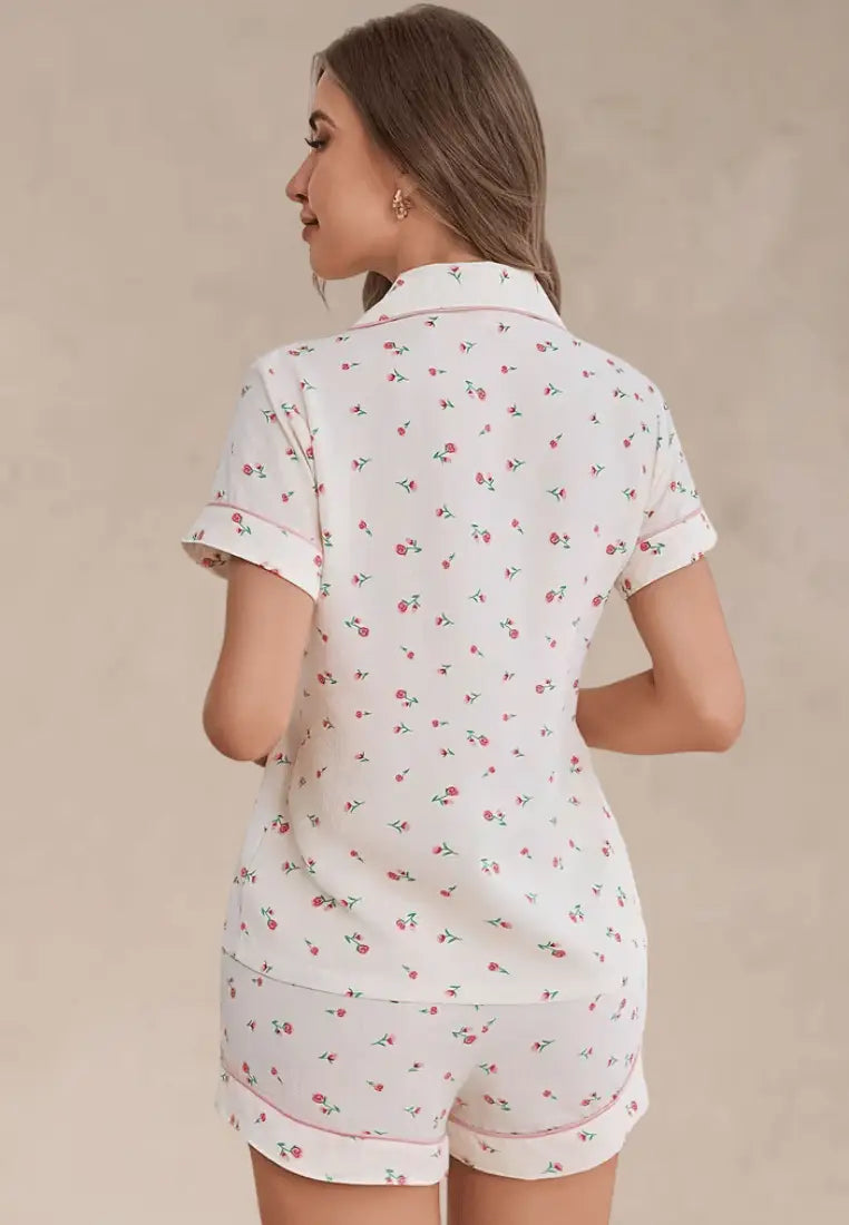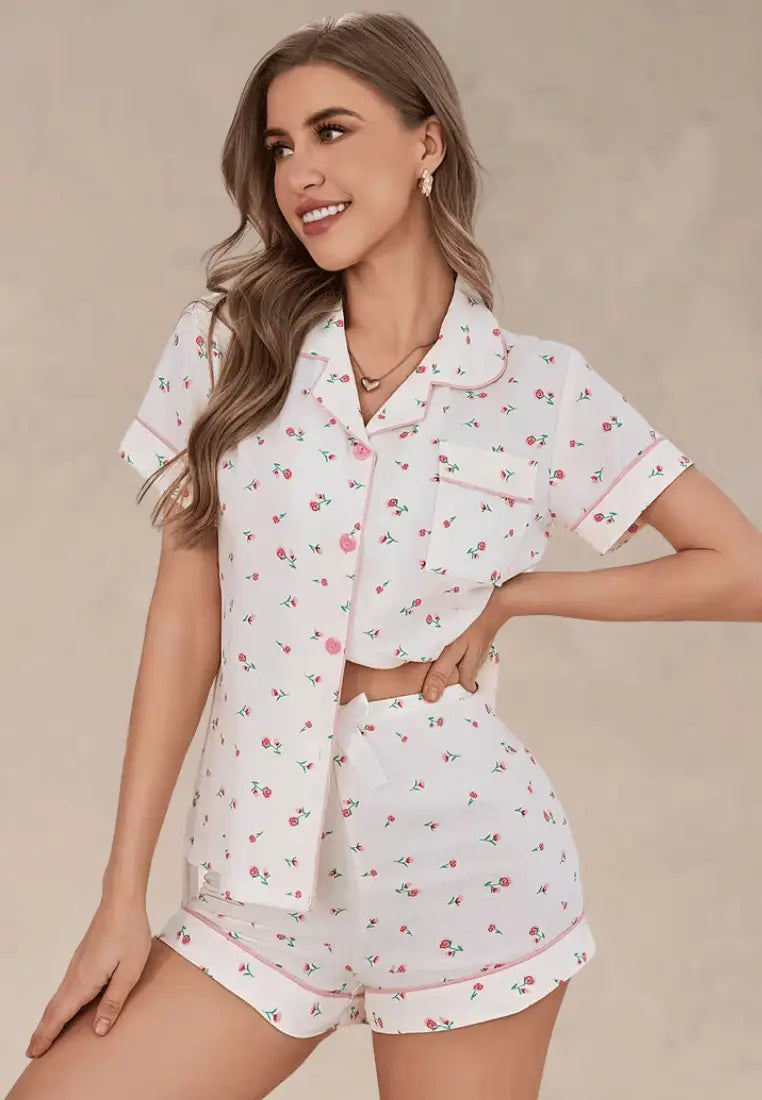 Górę stanowi koszulowa bluzka z krótkim rękawem, klasycznym kołnierzykiem i zapięciem na guziki. Uroku dodają różowe guziki, delikatna lamówka oraz nadruk w postaci drobnych różowych różyczek. Krótkie spodenki z elastycznym pasem i ozdobną kokardką pięknie dopełniają całość. Lekka, przewiewna tkanina o delikatnej fakturze sprawia, że piżamka jest idealna na lato.