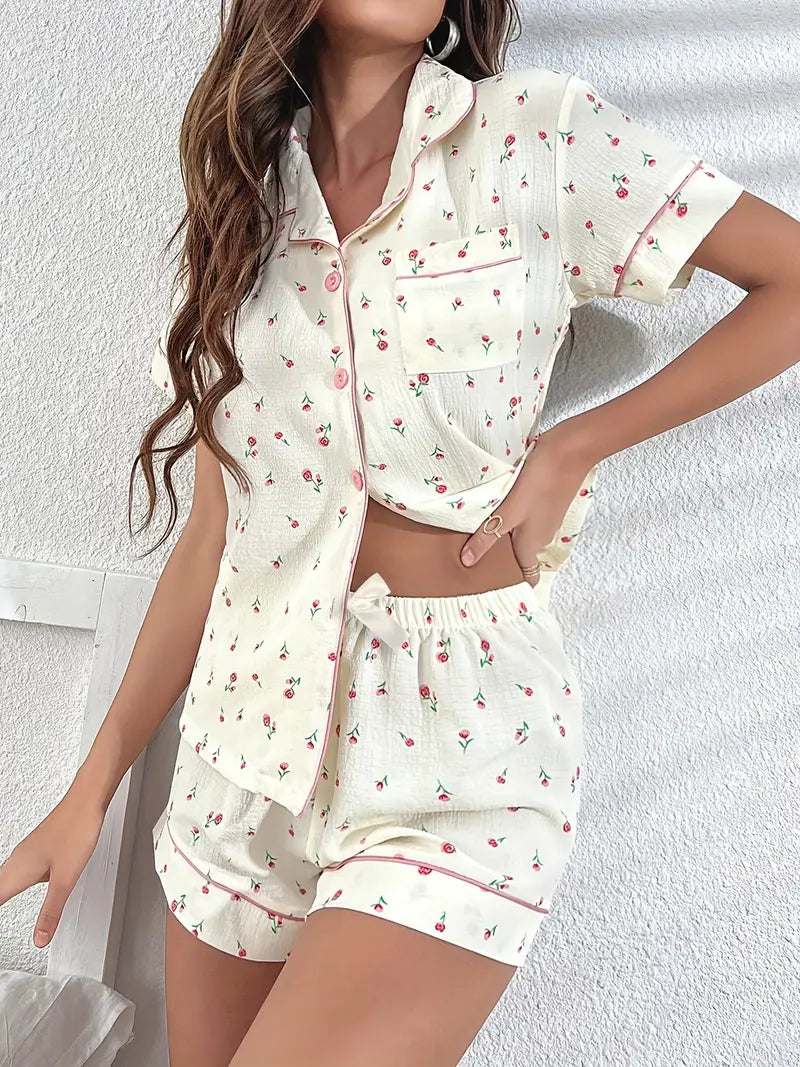 Bawełniana piżamka z krótkim rękawem i różanym nadrukiem w kolorze ecru