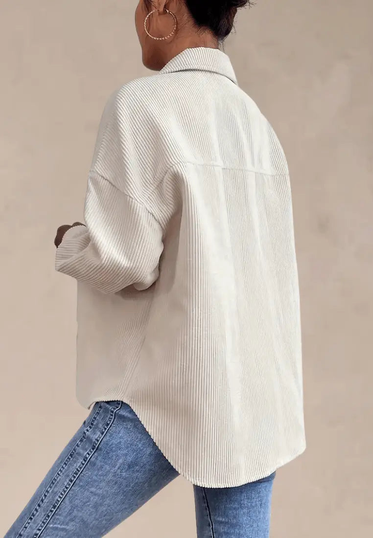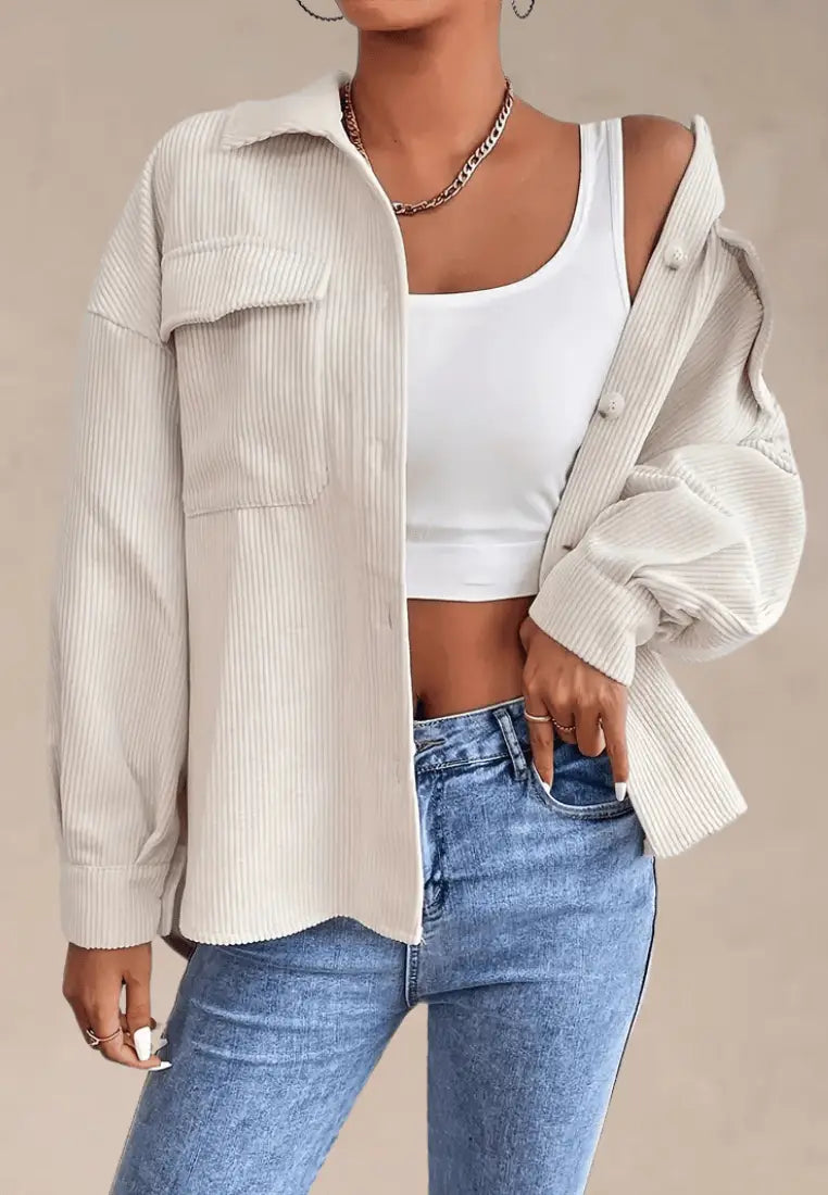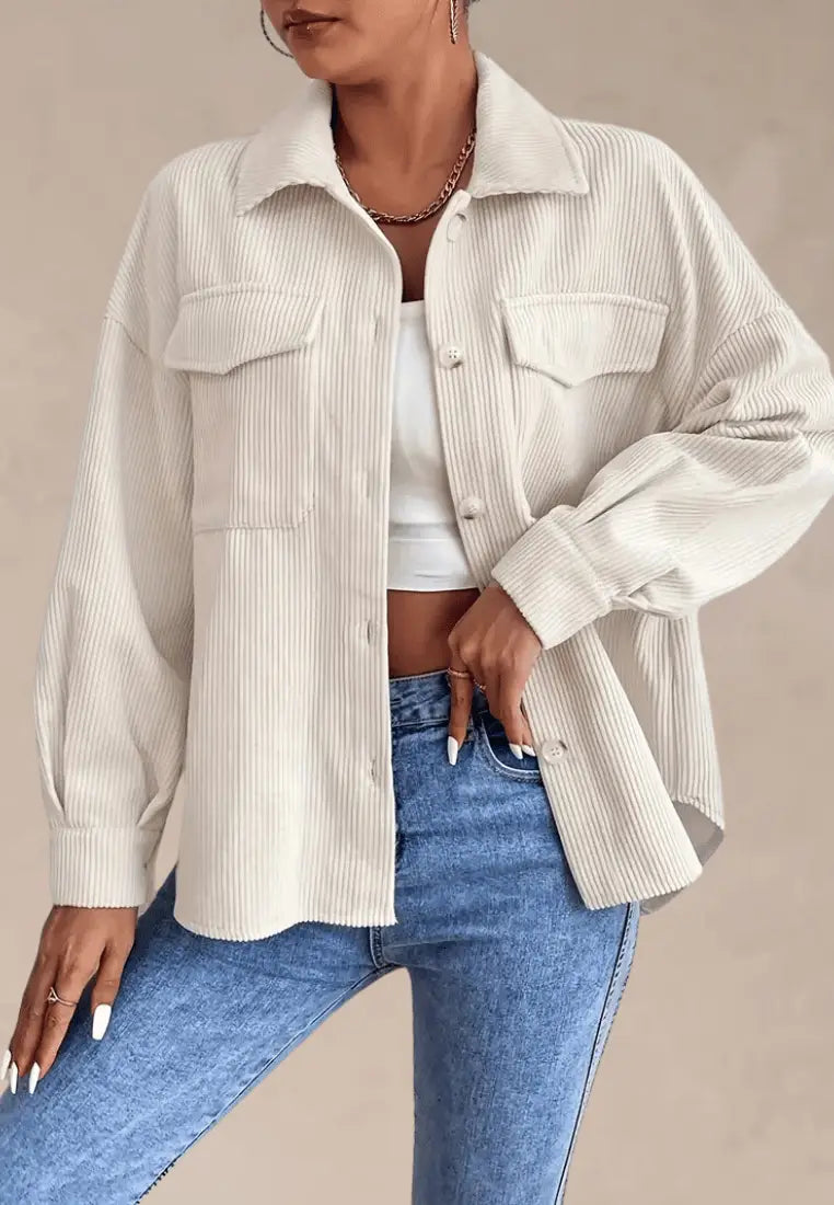 Kremowa koszula damska sztruksowa z kieszeniami i długim rękawem