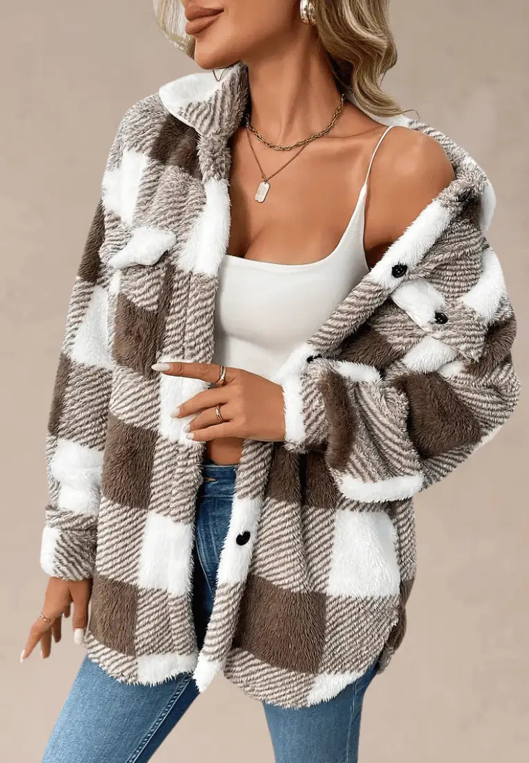 Miękka, puszysta tkanina jest przyjemna w dotyku i świetnie trzyma ciepło, a klasyczny wzór w kratę nadaje całości uniwersalnego charakteru. Zapięcie na guziki i praktyczne kieszenie z klapami dodają funkcjonalności.