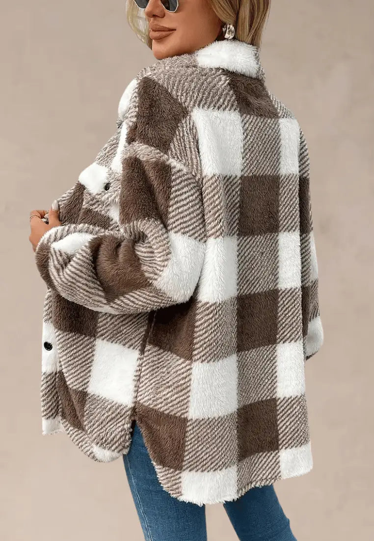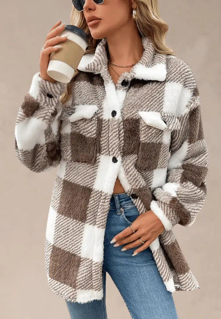 Brązowa kurtka damska polarowa długa w kratę z guzikami