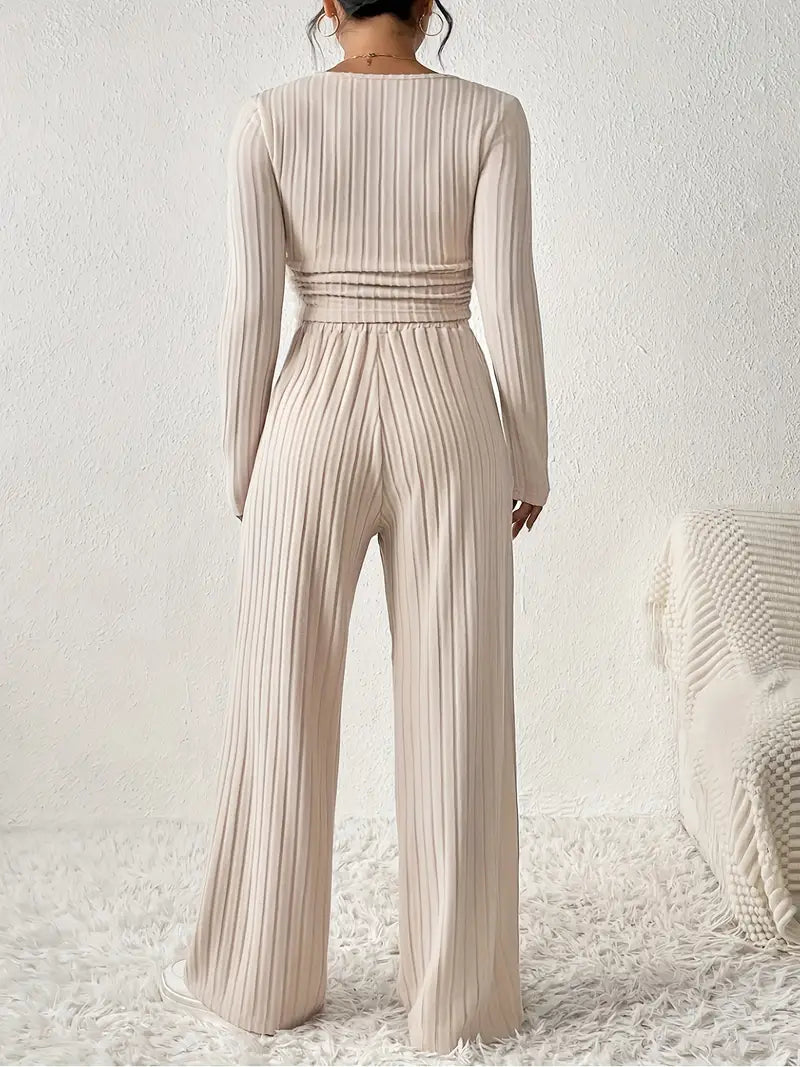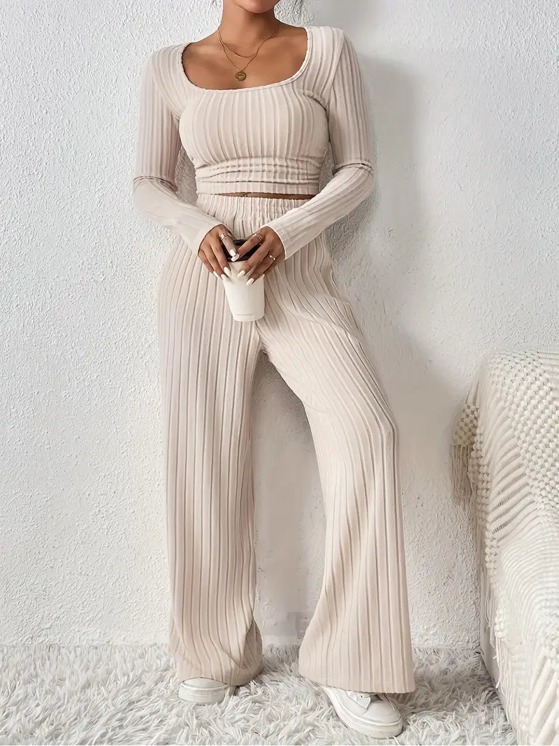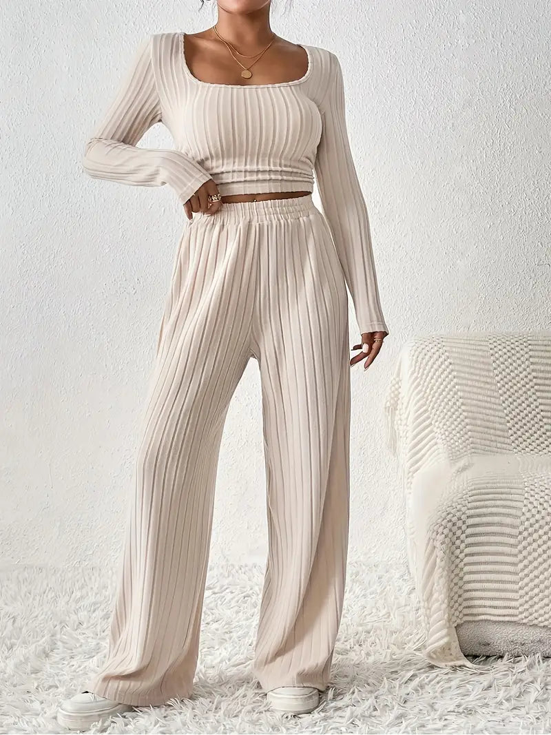 Beżowy prążkowany komplet dresowy z długim rękawem i szerokimi spodniami