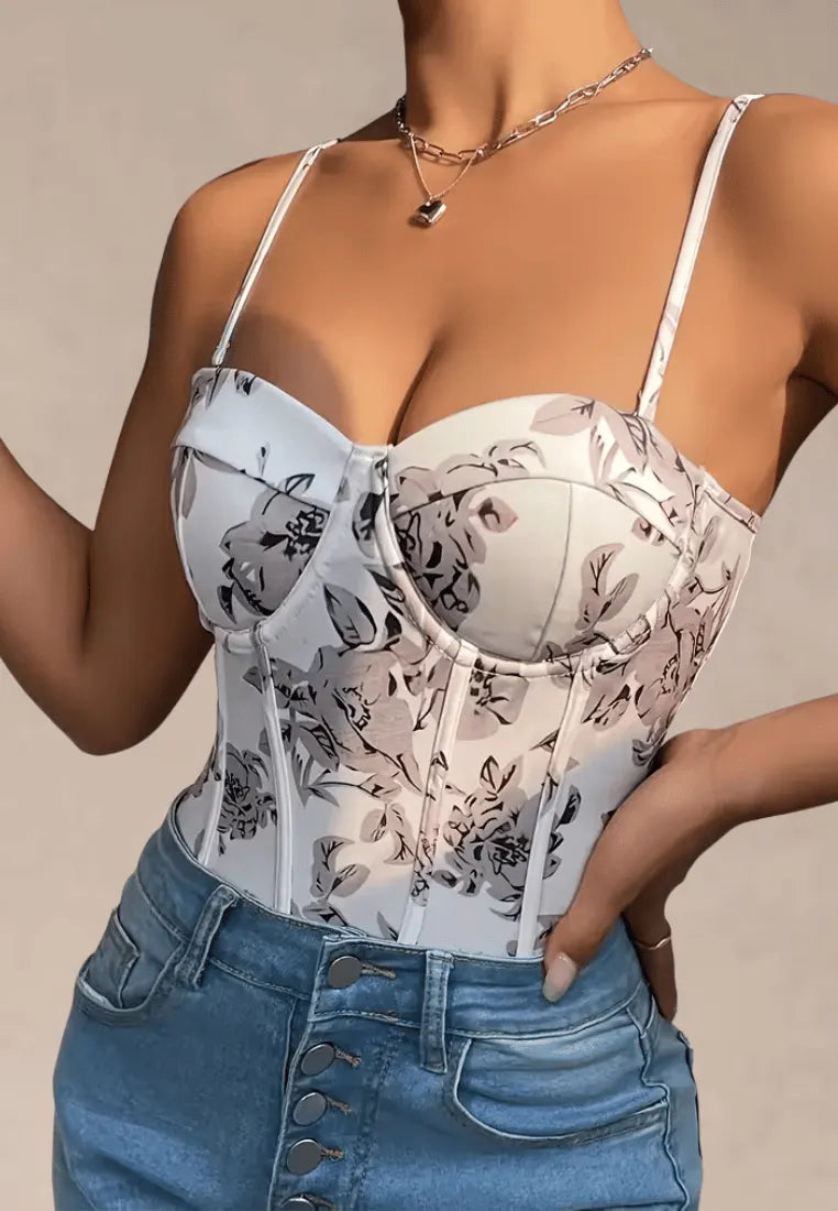 Białe body damskie gorsetowe w kwiatowy wzór na ramiączkach
