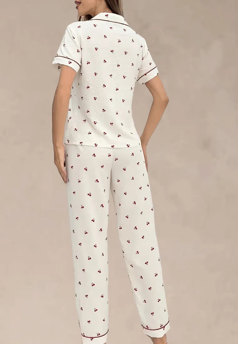 Uroczy i elegancki komplet piżamowy w klasycznym białym kolorze, ozdobiony subtelnym wzorem czerwonych wiśni. Idealna propozycja dla kobiet, które cenią połączenie dziewczęcego stylu z ponadczasową elegancją.