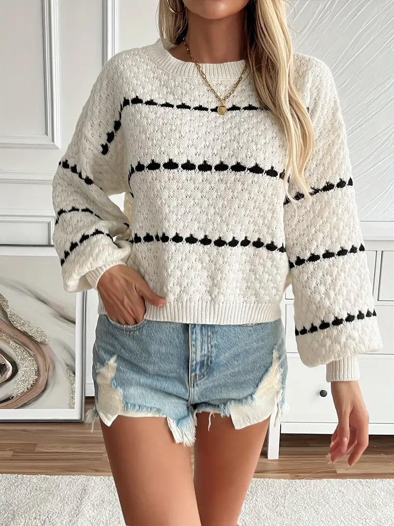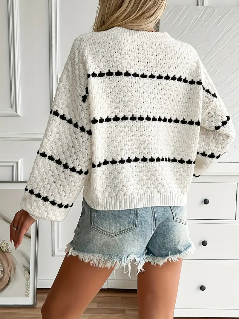 Biały sweter z czarnym wzorem w paski i luźnym krojem