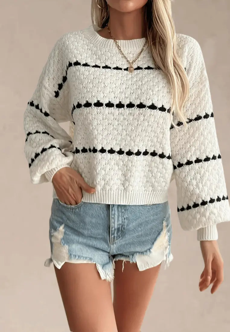 Biały sweter damski w czarne paski z okrągłym dekoltem