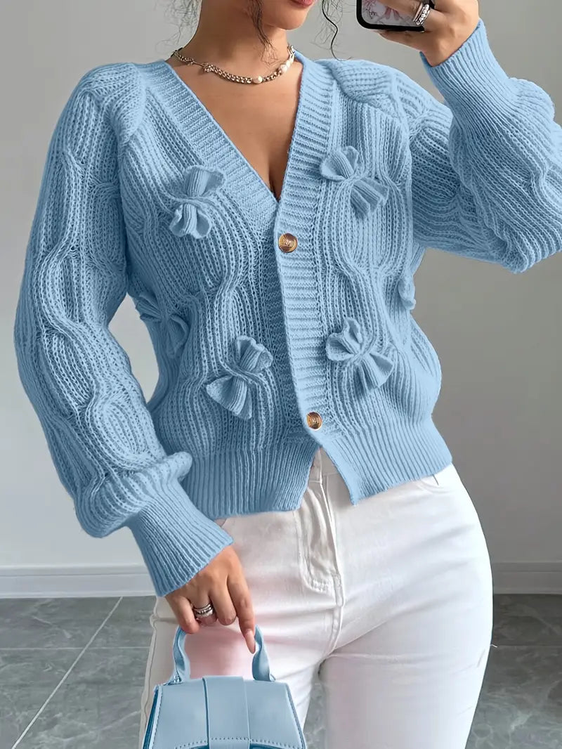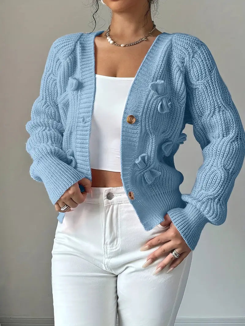 Błękitny kardigan z ozdobnymi kokardkami i warkoczowym splotem
