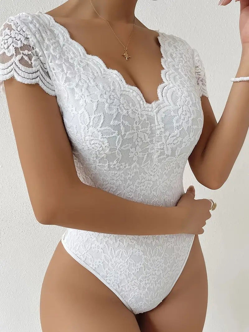 Ten biały koronkowy komplet bielizny z krótkim rękawem doskonale sprawdzi się zarówno jako element zmysłowej stylizacji wieczornej, jak i eleganckiej bielizny pod sukienkę. Lekki, oddychający materiał zapewnia komfort noszenia, a delikatna koronka sprawia, że każda kobieta poczuje się wyjątkowo.