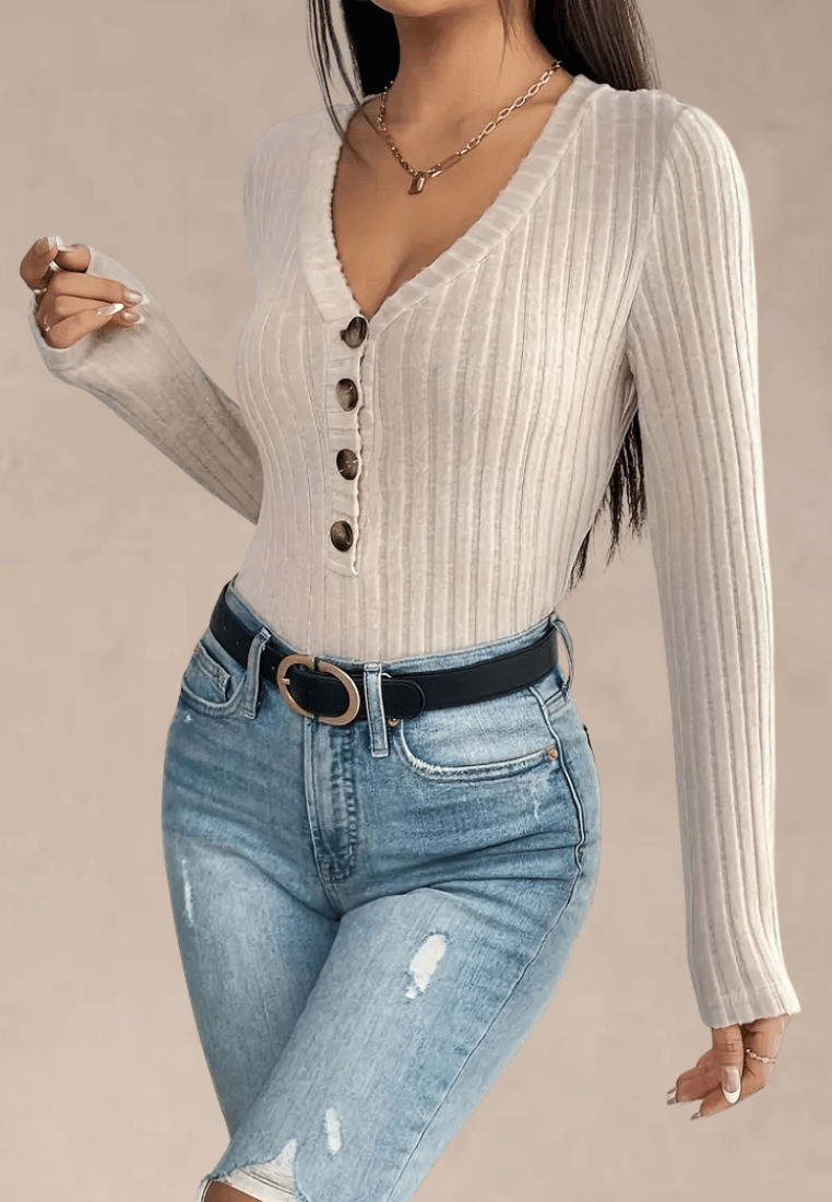 Beżowe body damskie prążkowane z guzikami i dopasowanym fasonem