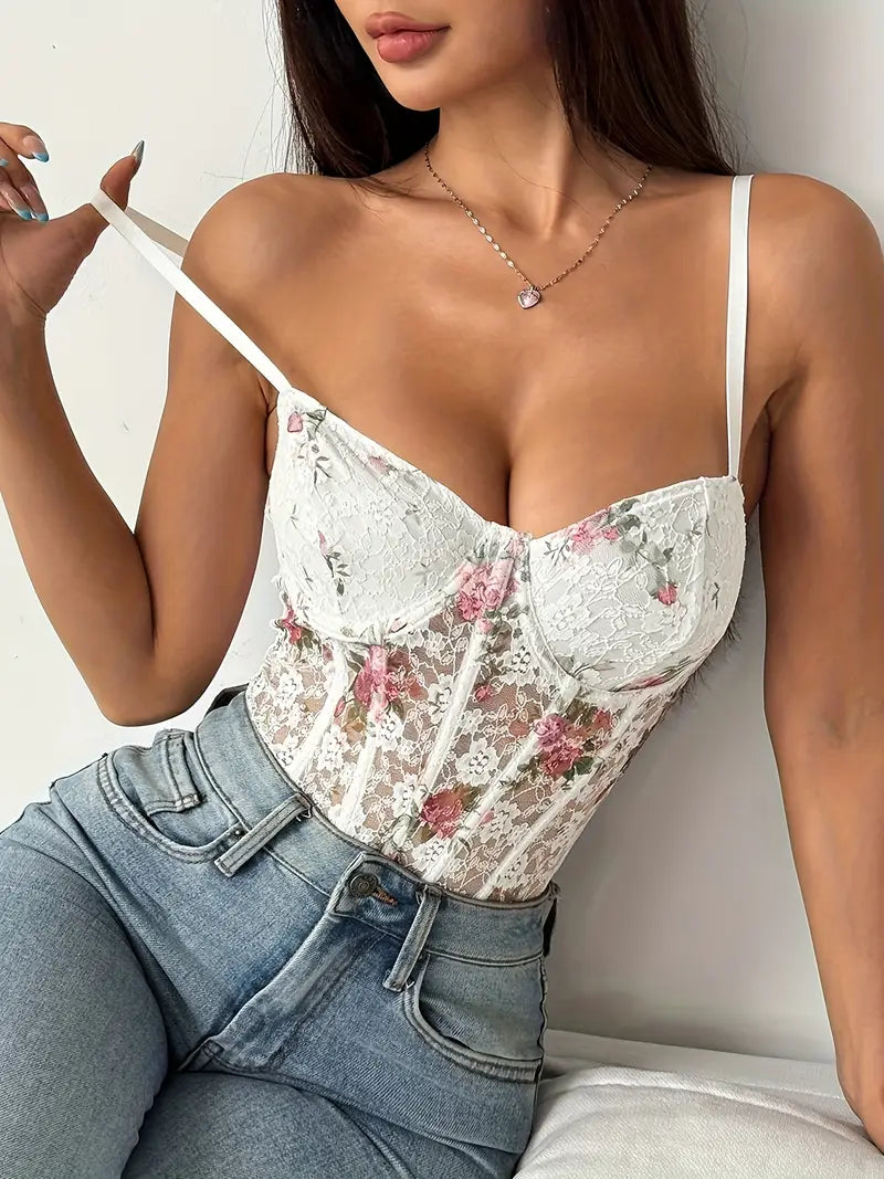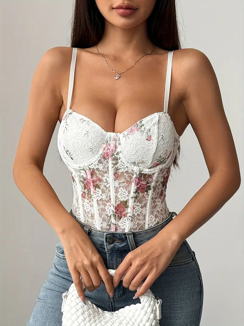 Body damskie koronkowe białe w kwiaty z fiszbinami