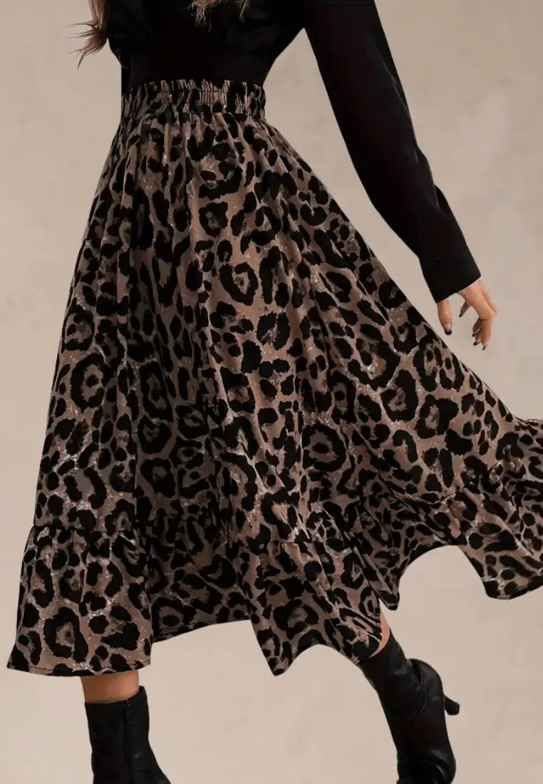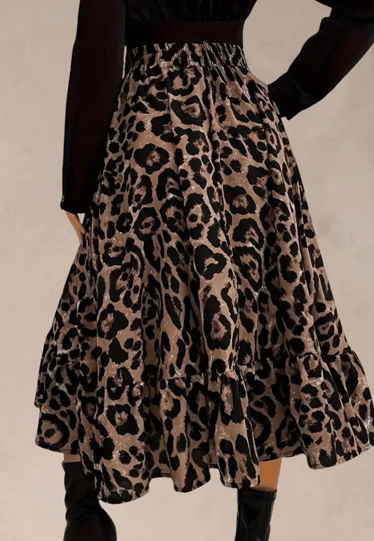 Postaw na odważny, pełen charakteru look z brązową spódnicą midi w panterkę z falbaną. Ten efektowny model łączy w sobie zmysłowość i wygodę, tworząc stylizację, która nie pozostanie niezauważona. Wzór w cętki w odcieniach brązu i czerni nadaje całości drapieżnego, modowego charakteru, a lekko rozkloszowany krój z falbaną u dołu dodaje zwiewności i kobiecego wdzięku.