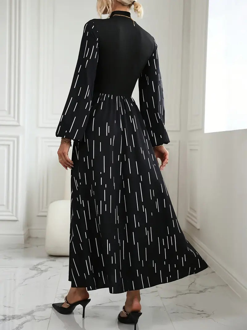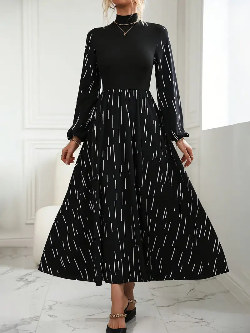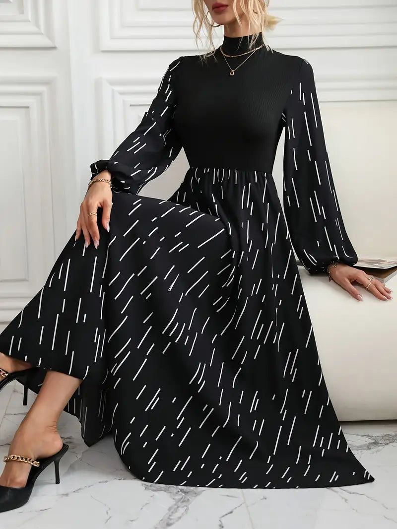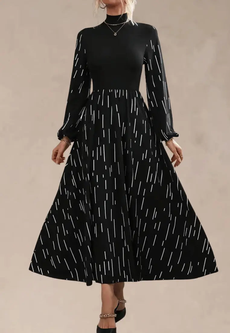 Odkryj elegancję w nowoczesnym wydaniu dzięki czarnej długiej sukience z wysokim kołnierzem i subtelnym białym geometrycznym wzorem. Ten model łączy w sobie szyk z wygodą – dopasowana góra pięknie podkreśla talię, a rozkloszowany dół swobodnie opływa sylwetkę, nadając jej lekkości. Długie, lekko bufiaste rękawy dodają kreacji wyrafinowania, a pionowy wzór optycznie wysmukla figurę.