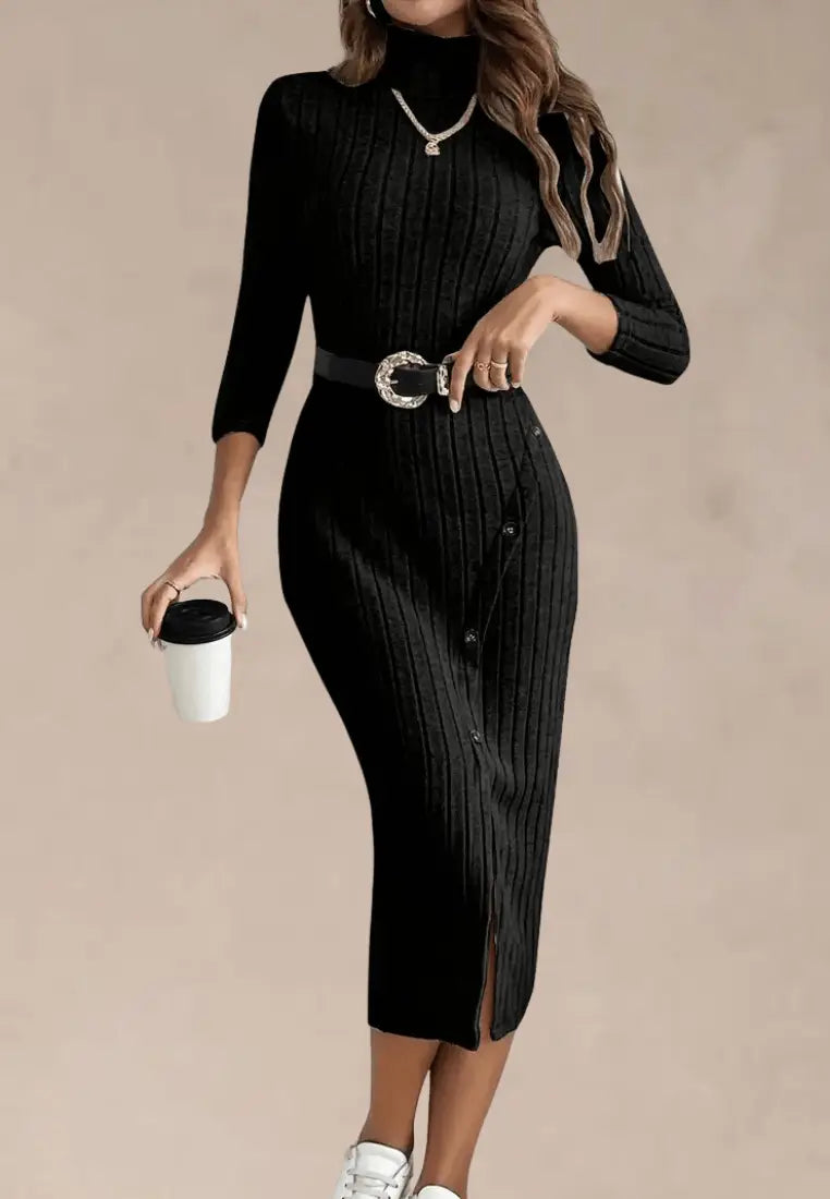 Odkryj połączenie elegancji i wygody z czarną dzianinową sukienką midi z golfem i subtelnym rozcięciem zapinanym na guziki. Wykonana z miękkiego, elastycznego materiału o prążkowanej strukturze, perfekcyjnie dopasowuje się do sylwetki, podkreślając kobiece kształty.