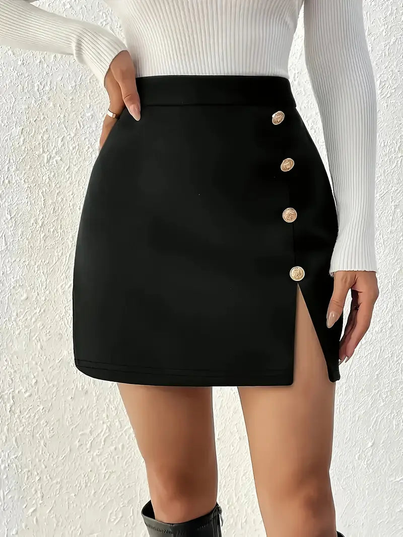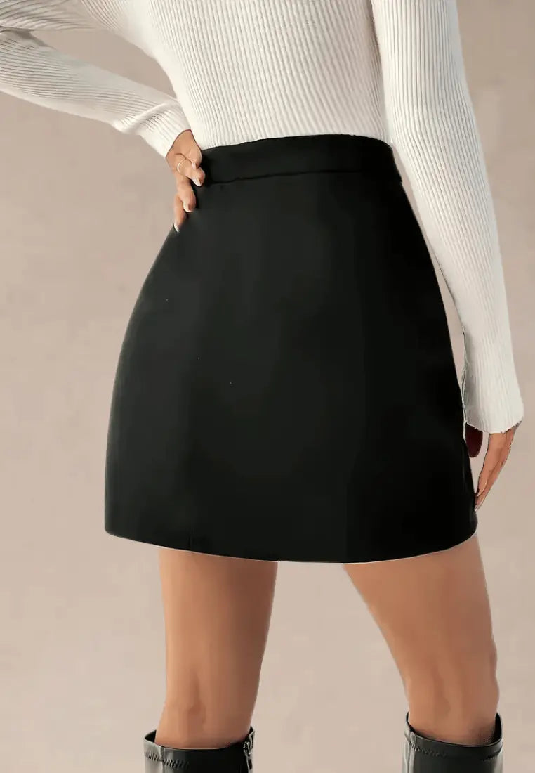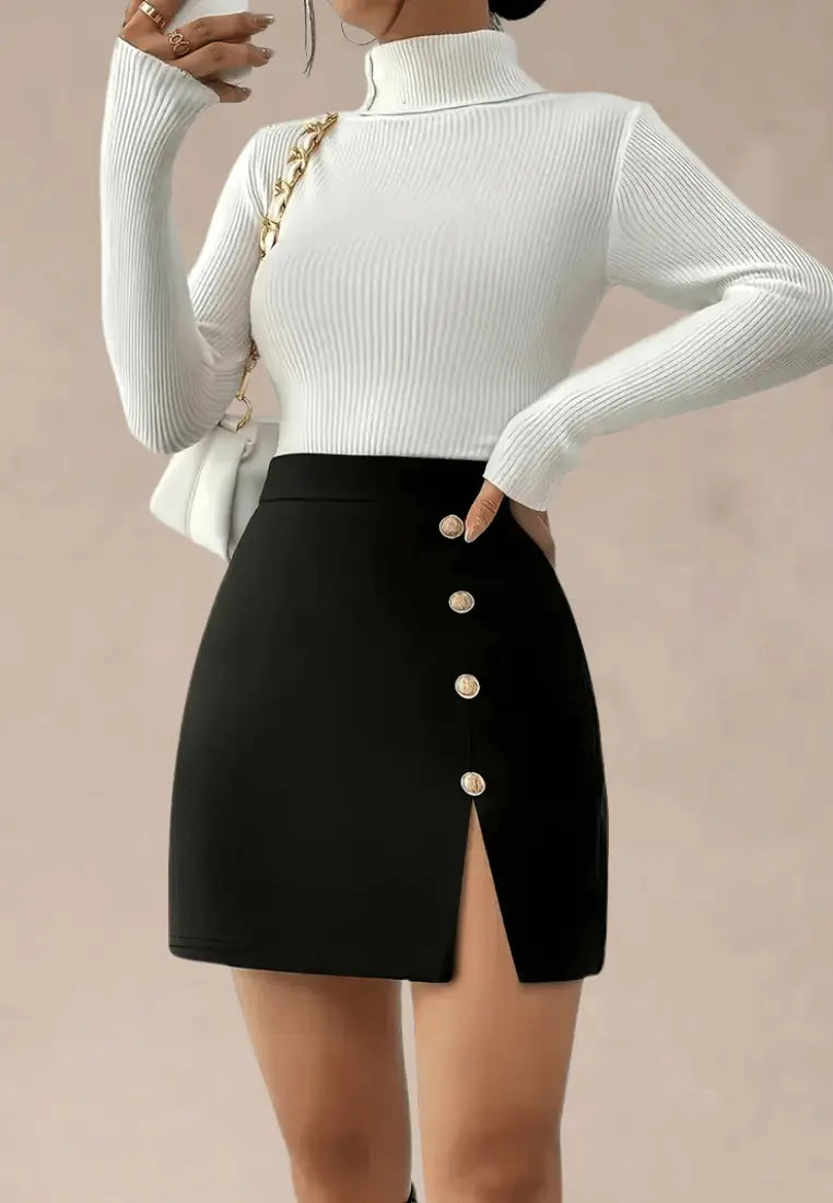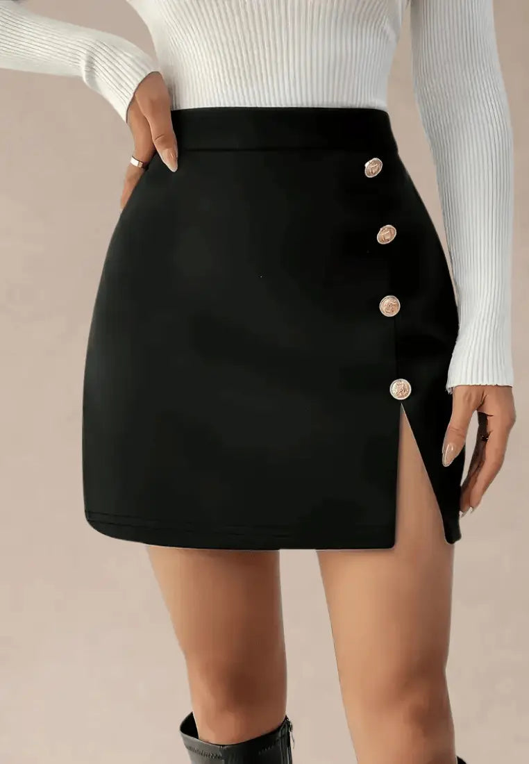 Podkreśl swoją kobiecość z czarną mini spódnicą z rozcięciem i ozdobnymi guzikami – klasyka w nowoczesnym wydaniu. To idealny model dla kobiet ceniących prostotę z nutą zmysłowości. Gładki materiał pięknie przylega do sylwetki, a wyraziste złote guziki wzdłuż asymetrycznego rozcięcia przyciągają spojrzenia.