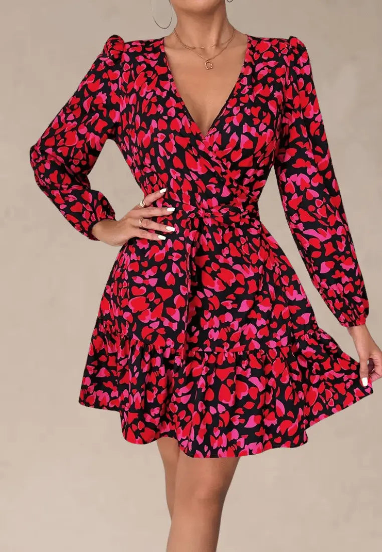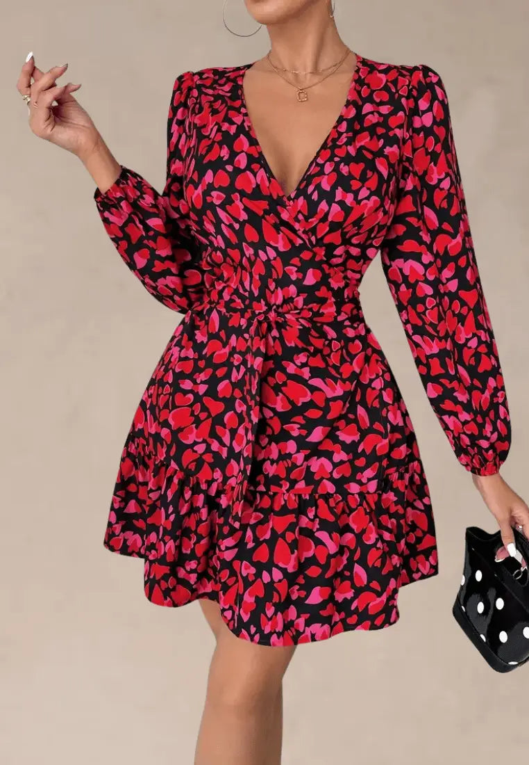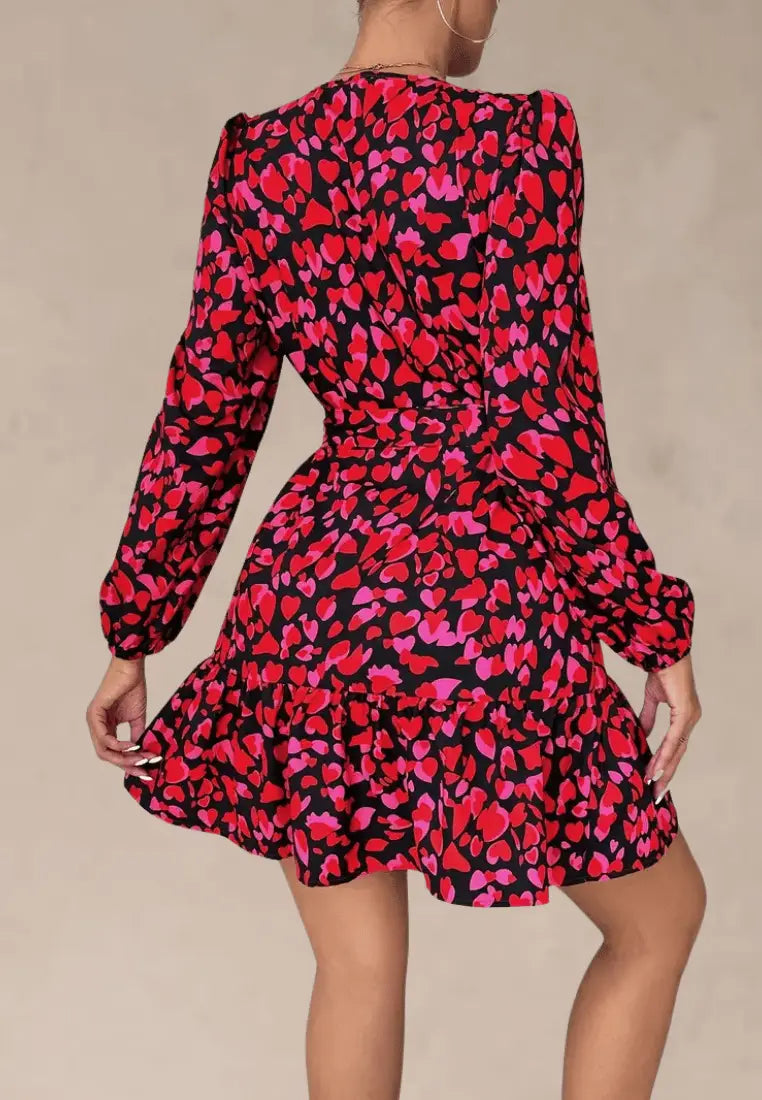 Czerwona sukienka w print serca z falbaną i kopertowym dekoltem
