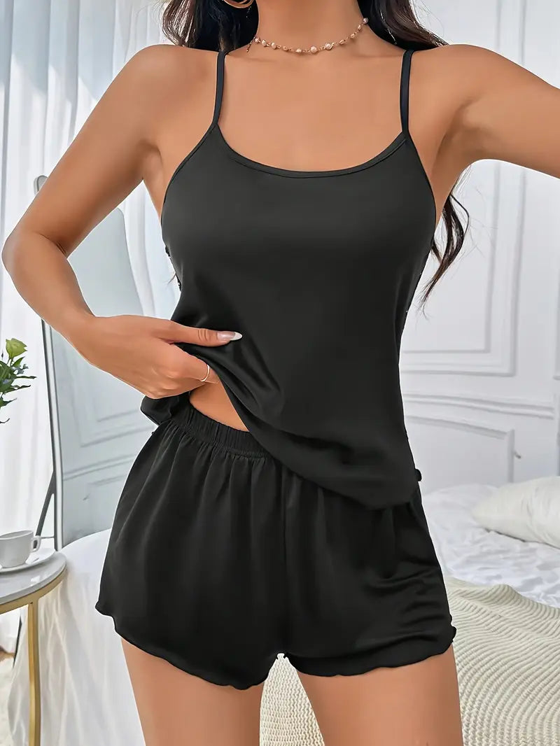 Top na cienkich ramiączkach z przodu prezentuje się minimalistycznie i gładko, natomiast tył zjawiskowo zdobi szeroki panel ażurowej koronki w kwiatowy wzór, który odsłania plecy i dodaje zmysłowego charakteru. Krótkie satynowe szorty z falowanym wykończeniem i elastycznym pasem idealnie dopełniają całość, zapewniając komfort i swobodę ruchów.