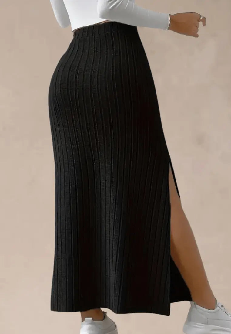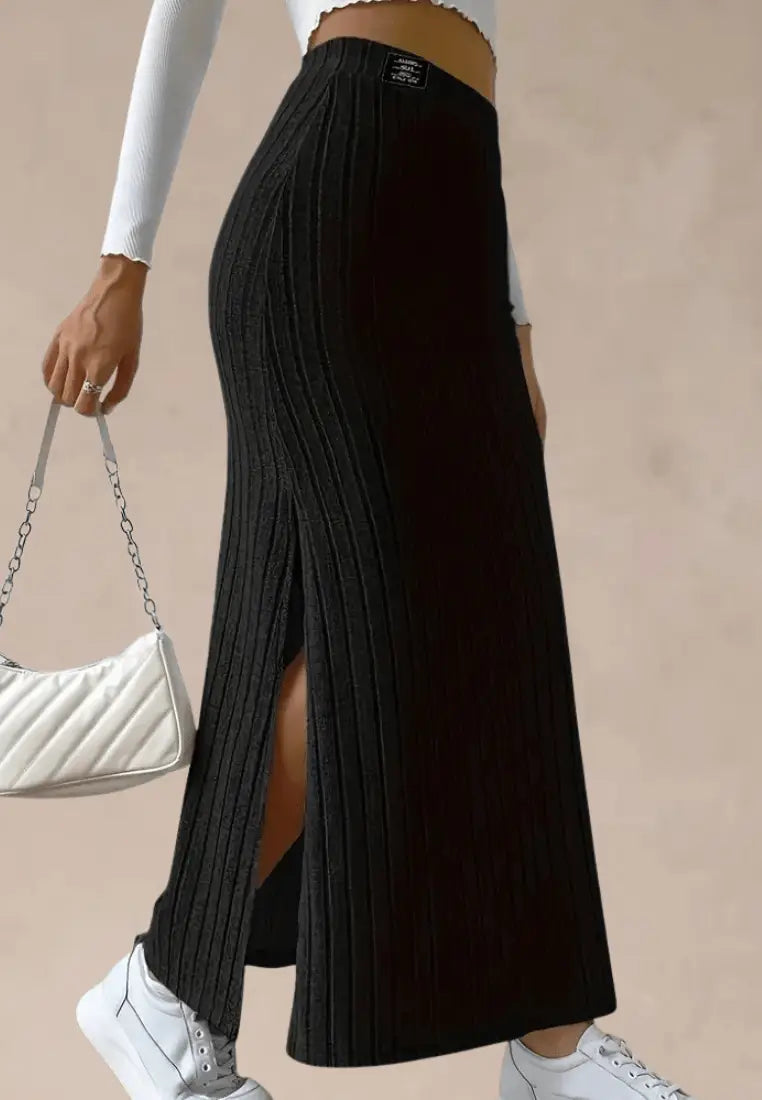 Postaw na połączenie wygody i kobiecego wdzięku z czarną prążkowaną spódnicą maxi z rozcięciem. Ten model zachwyca prostotą w nowoczesnym wydaniu – miękki, elastyczny materiał pięknie dopasowuje się do sylwetki, a pionowe prążki optycznie ją wysmuklają.