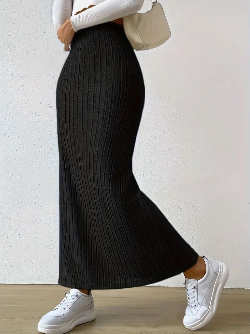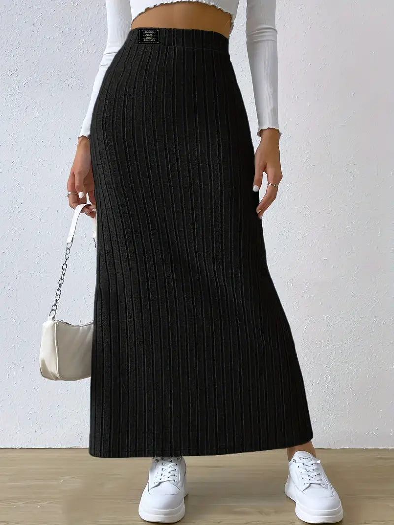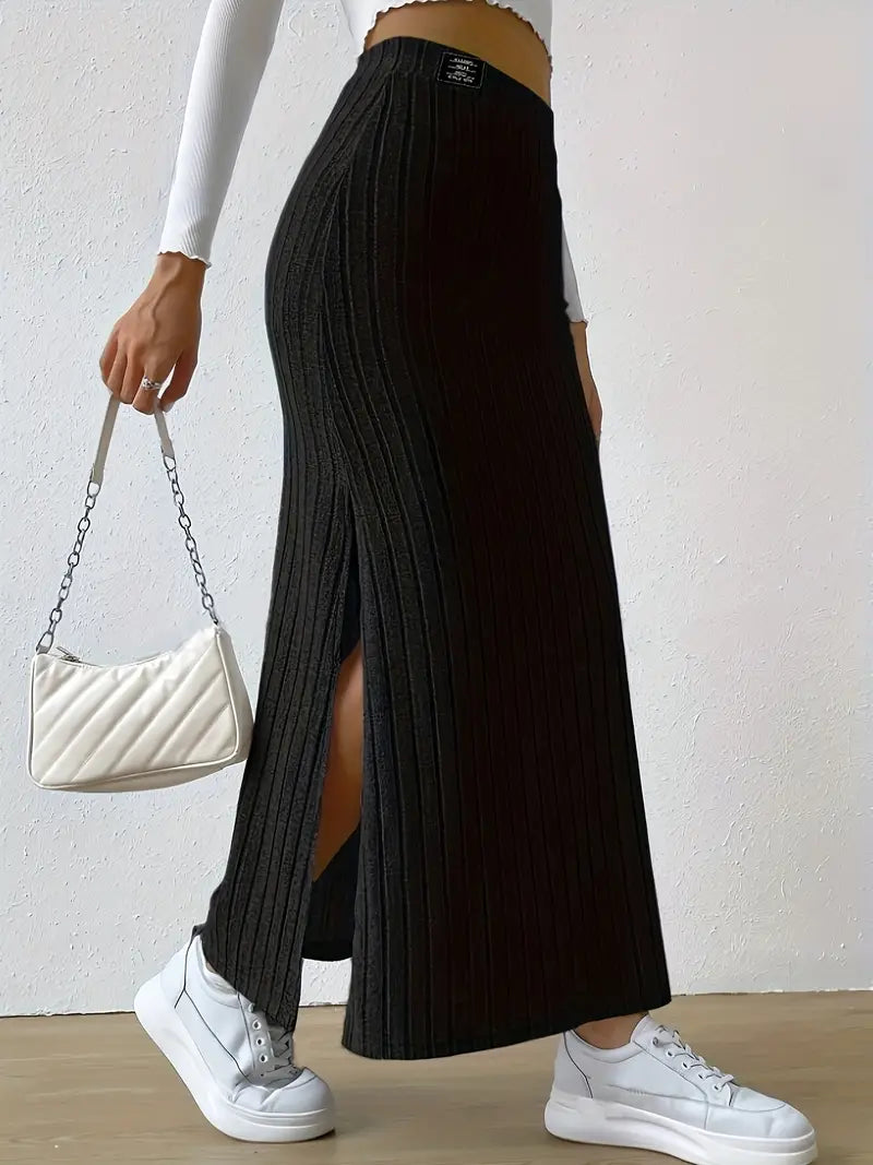 Czarna prążkowana spódnica maxi z rozcięciem na udzie