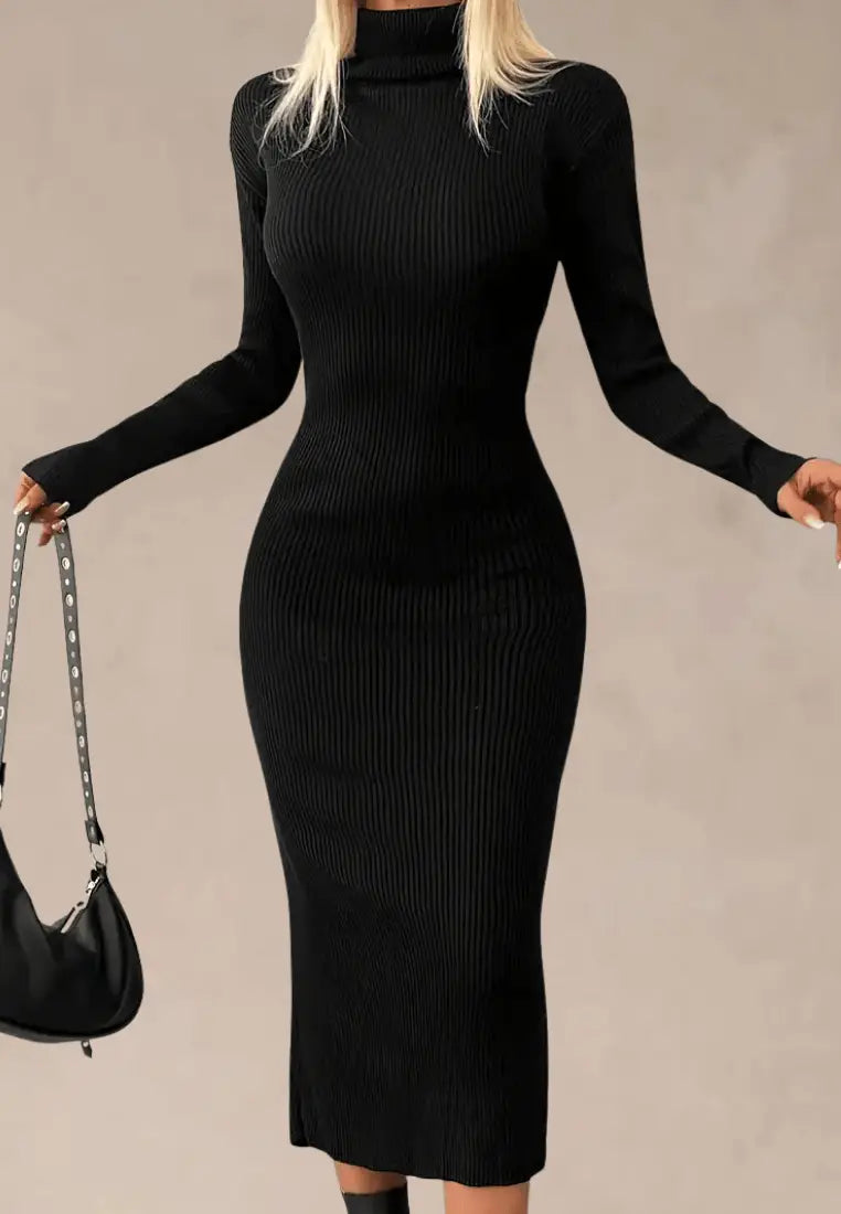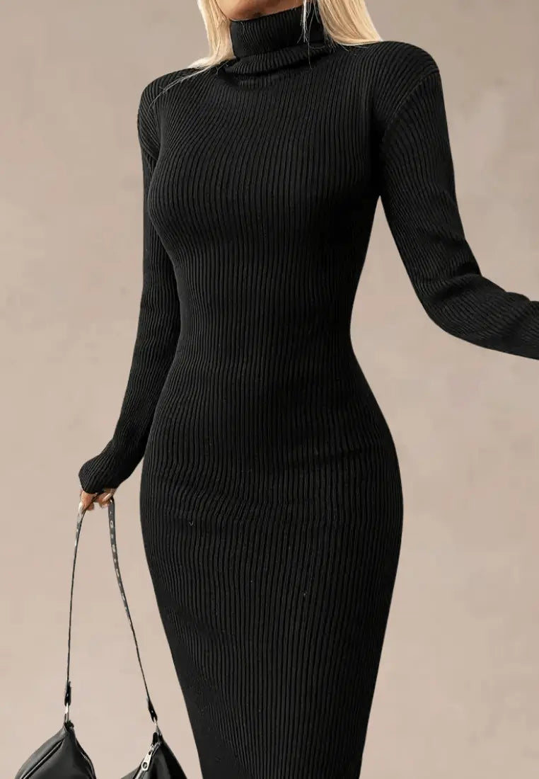 Odkryj ponadczasową elegancję z czarną prążkowaną sukienką midi, która łączy w sobie minimalizm i kobiecy szyk. Wykonana z miękkiego, elastycznego materiału, idealnie dopasowuje się do sylwetki, podkreślając jej atuty. Golf i długie rękawy dodają jej klasy, a prążkowana faktura nadaje całości subtelnej struktury.