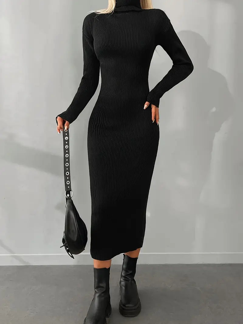 Czarna prążkowana sukienka midi z golfem i długim rękawem