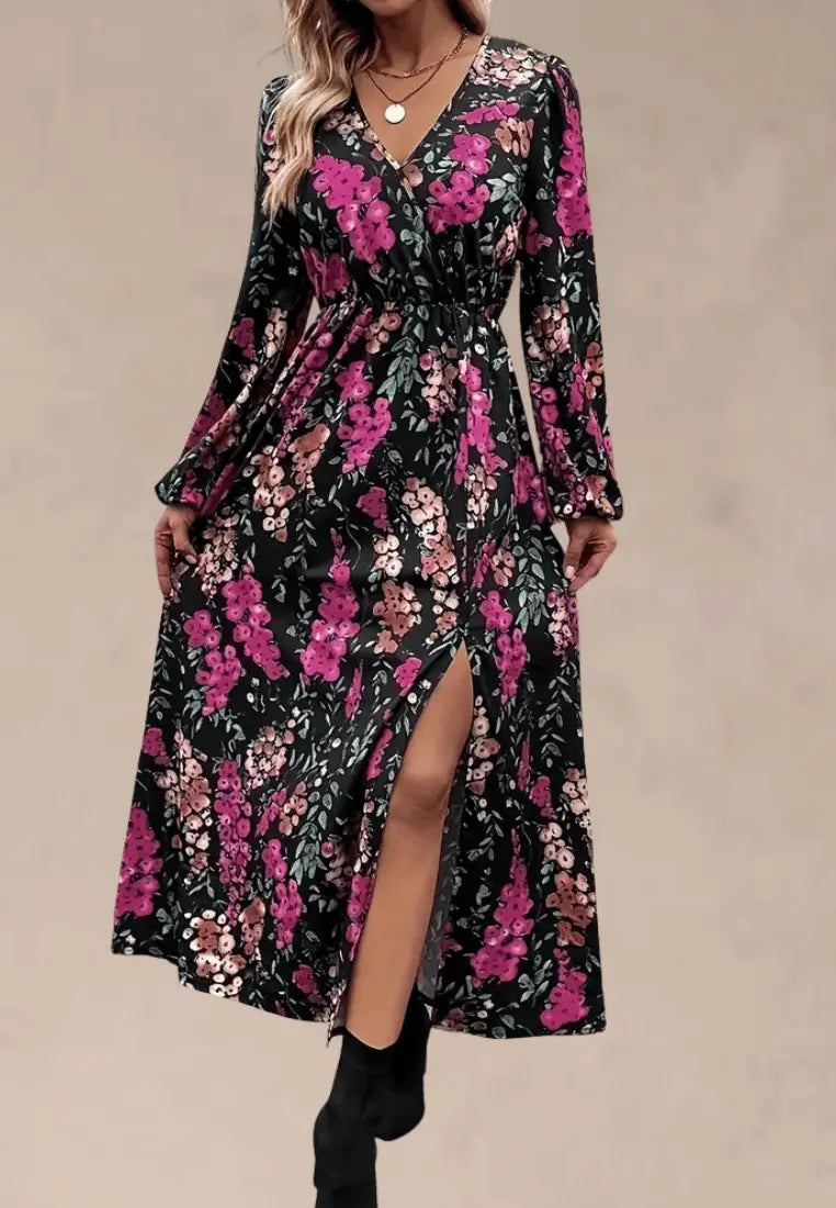 Czarna sukienka maxi w kwiaty z rozcięciem i dekoltem kopertowym