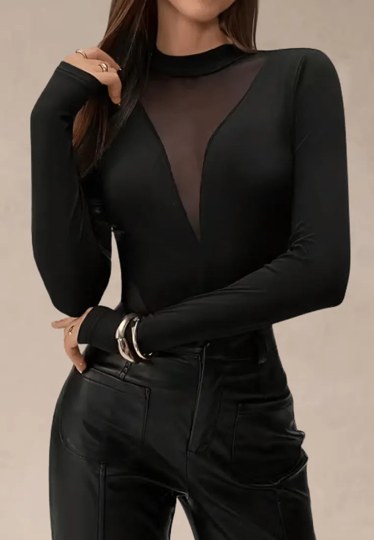 Czarne body damskie z długim rękawem i siateczkowym dekoltem w kształcie V