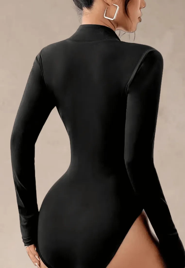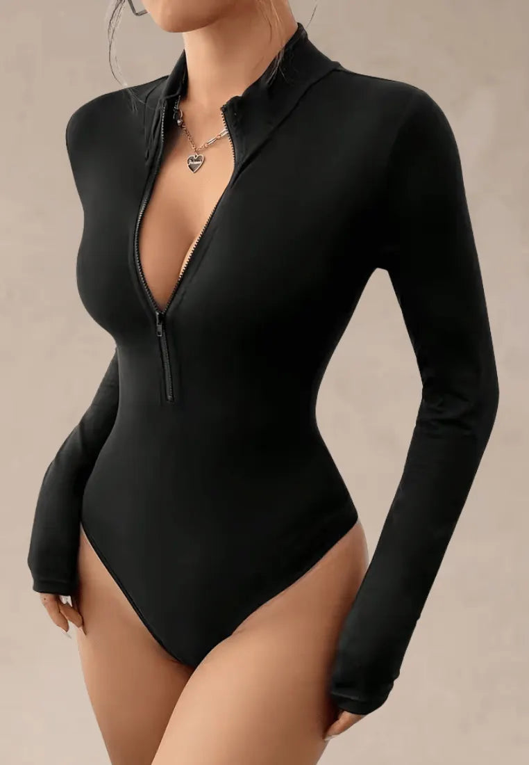 Zamek na przodzie pozwala regulować głębokość dekoltu — od subtelnego po wyjątkowo odważny, dzięki czemu body dopasuje się do każdej stylizacji i okazji. Zabudowany kołnierzyk nadaje całości eleganckiego charakteru, a długie rękawy wysmuklają ramiona i optycznie modelują sylwetkę.