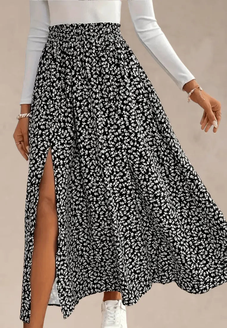 Spódnica zachwyca drobnym kwiatowym printem na głębokim, czarnym tle, który dodaje uroku każdej stylizacji. Dodatkowym atutem jest zmysłowe rozcięcie z przodu, które subtelnie eksponuje nogę, dodając całości kobiecego charakteru i lekkości w ruchu.