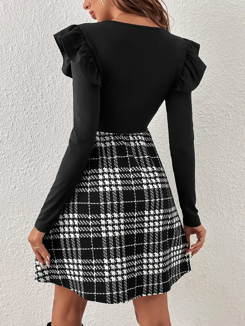 Czarno-biała sukienka mini z falbankami i kratką pepitką