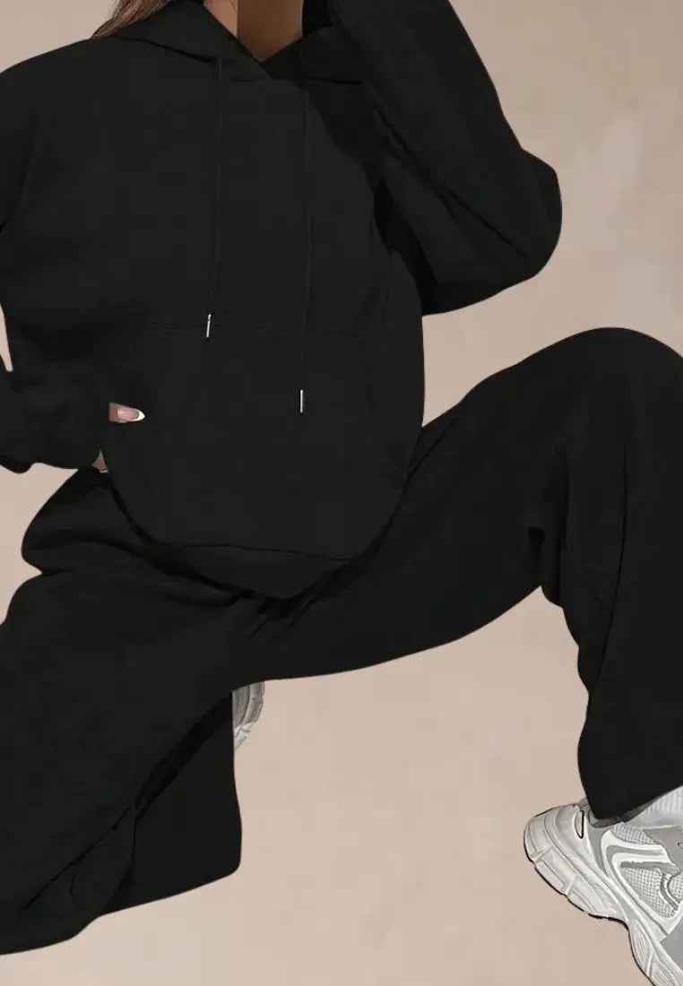Czarny komplet dresowy damski z kapturem i szerokimi nogawkami