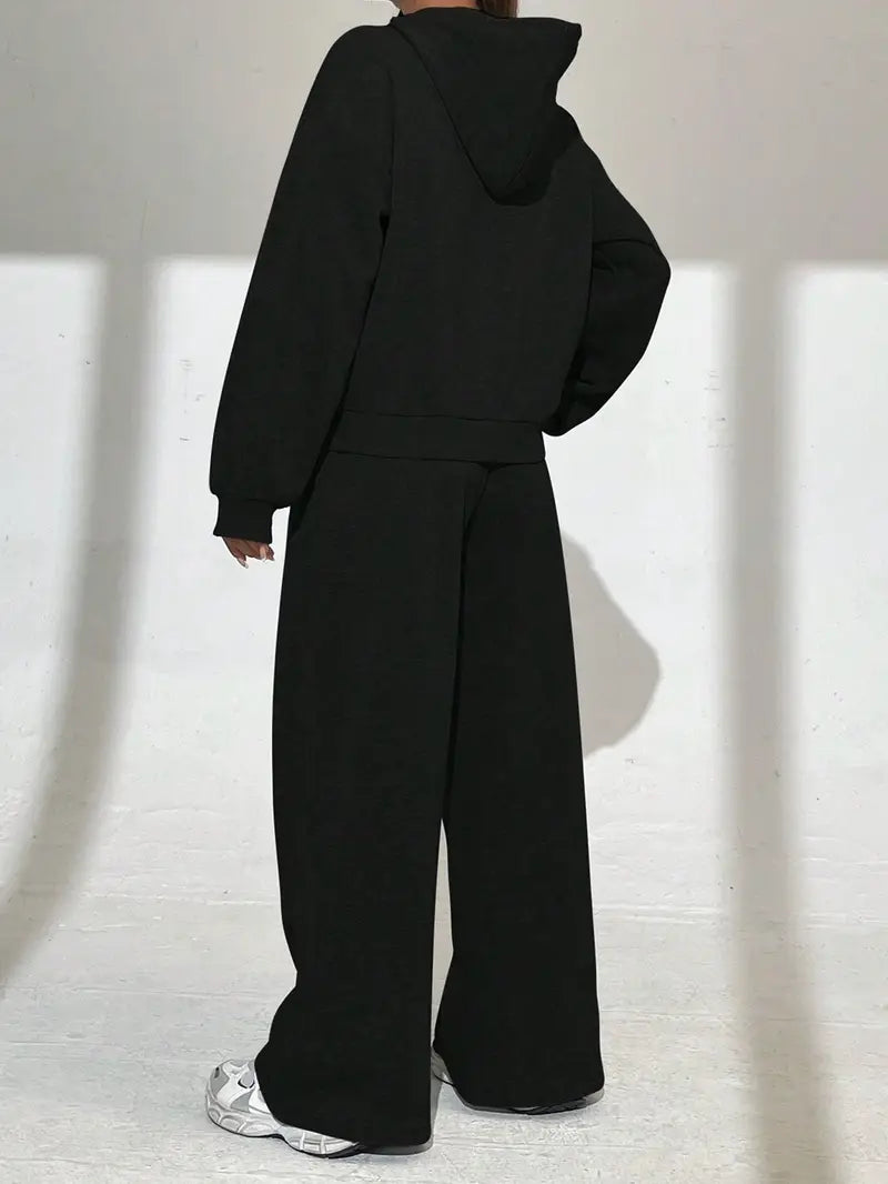 Czarny damski komplet dresowy z szerokimi spodniami i kapturem