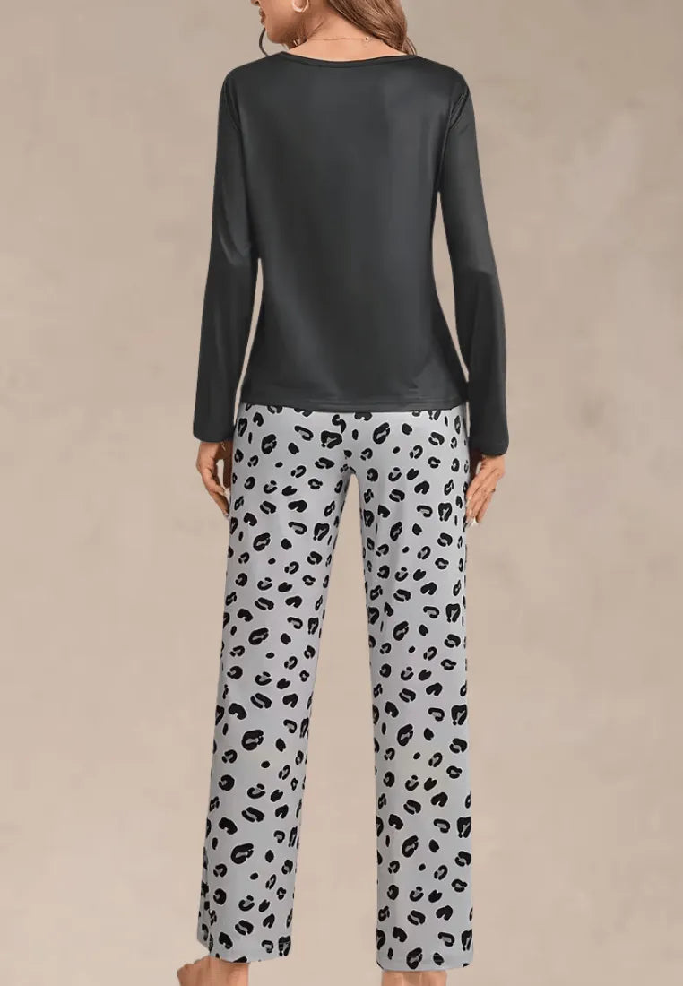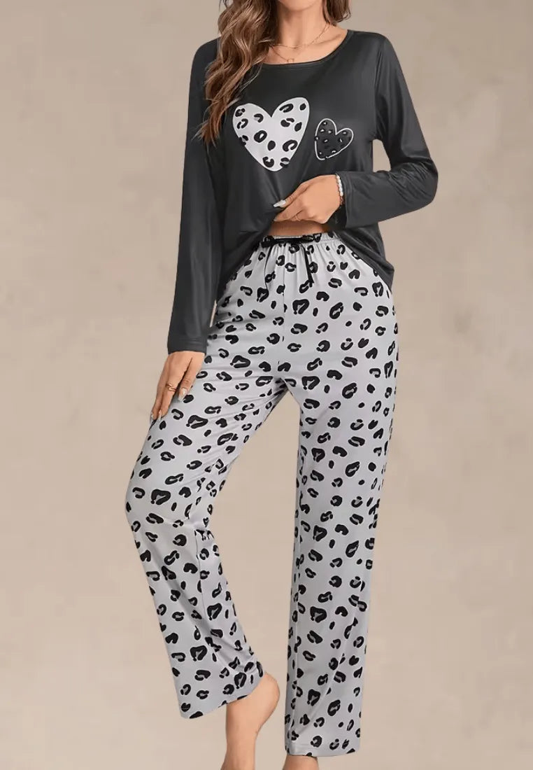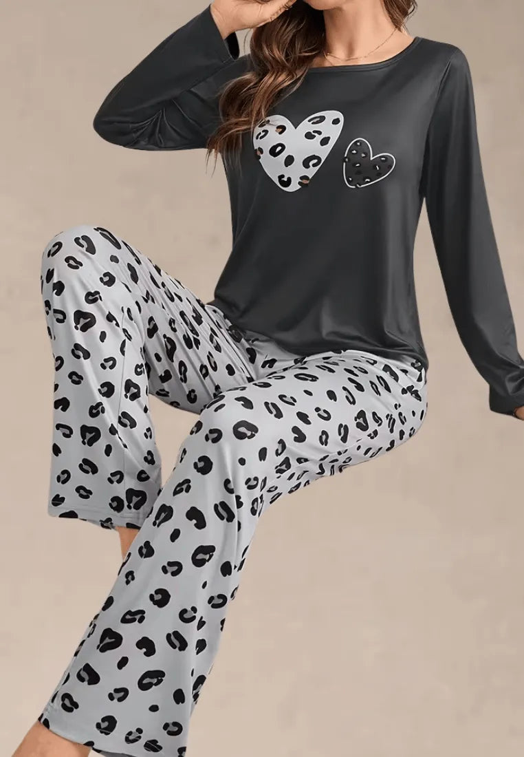 Nowoczesny i wygodny komplet piżamowy w modnym odcieniu ciemnej szarości, który łączy romantyczny motyw serduszek z drapieżnym wzorem panterki. To idealny wybór dla kobiet, które lubią stylowe i niebanalne zestawy do spania i domowego relaksu.