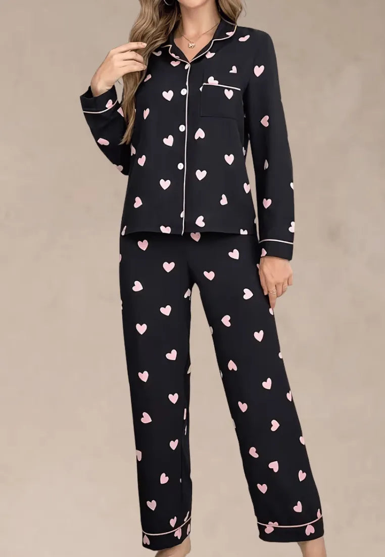 Czarny komplet piżamowy damski z długim rękawem i długimi spodniami w serduszka