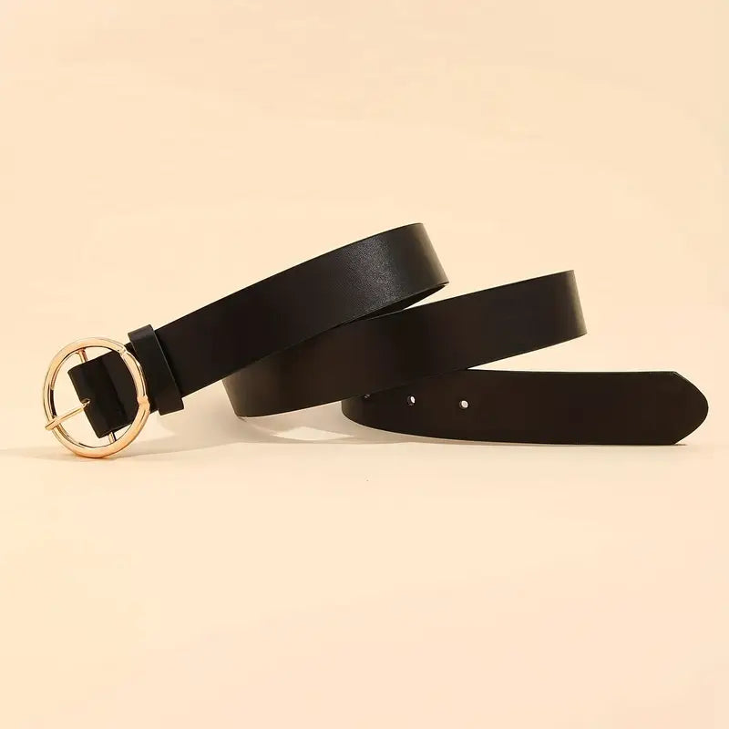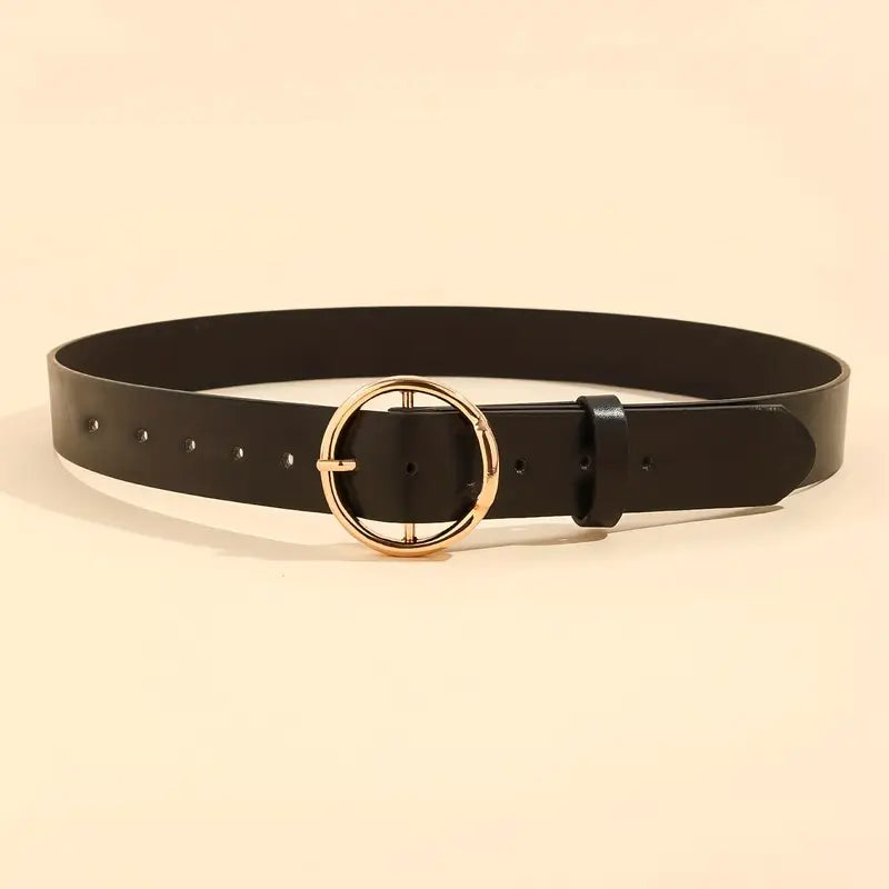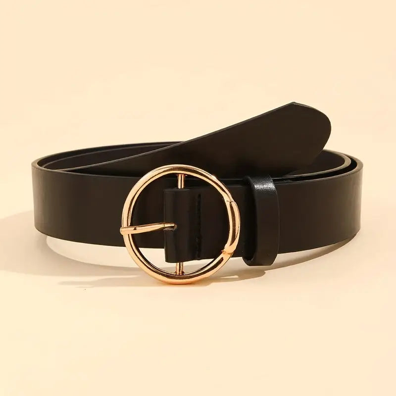 Podkreśl swoją talię z eleganckim czarnym paskiem damskim ozdobionym okrągłą złotą klamrą. To klasyczny dodatek, który świetnie sprawdzi się zarówno w codziennych, jak i bardziej eleganckich stylizacjach.