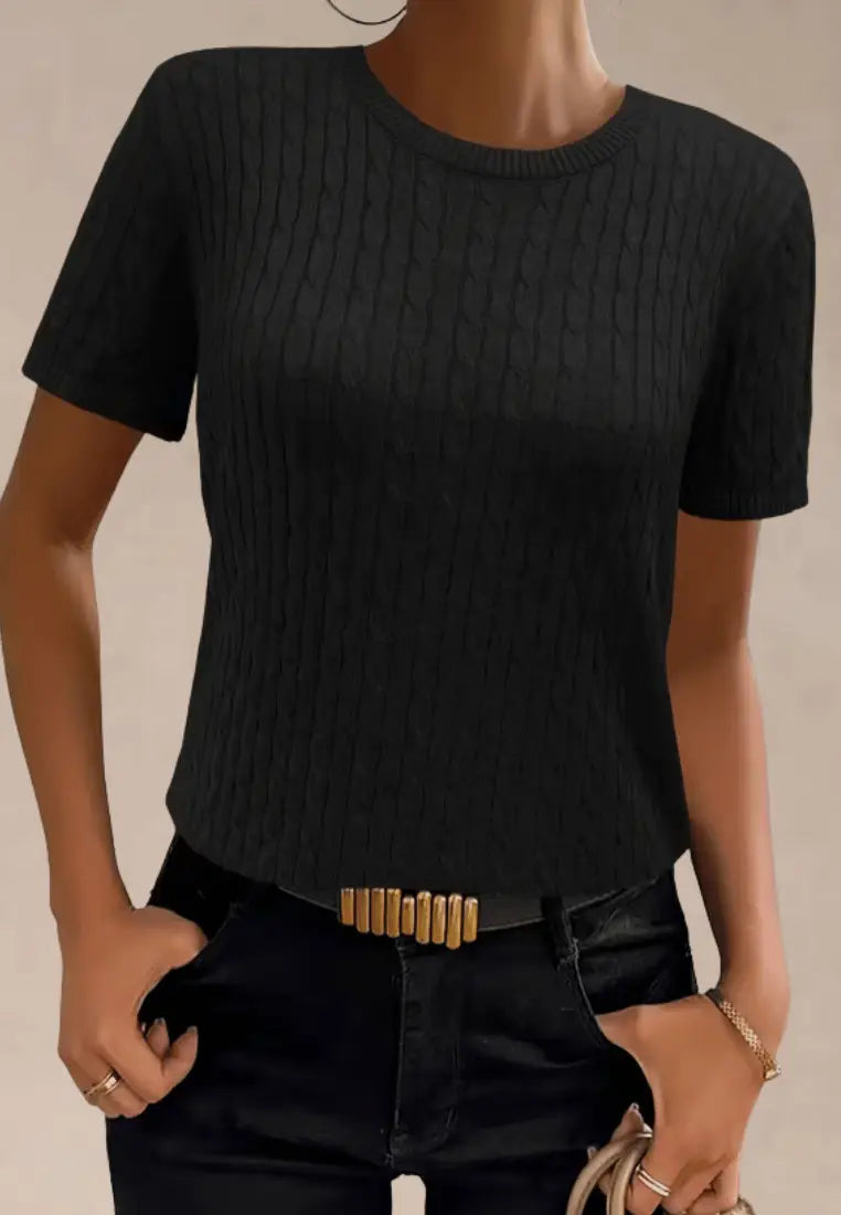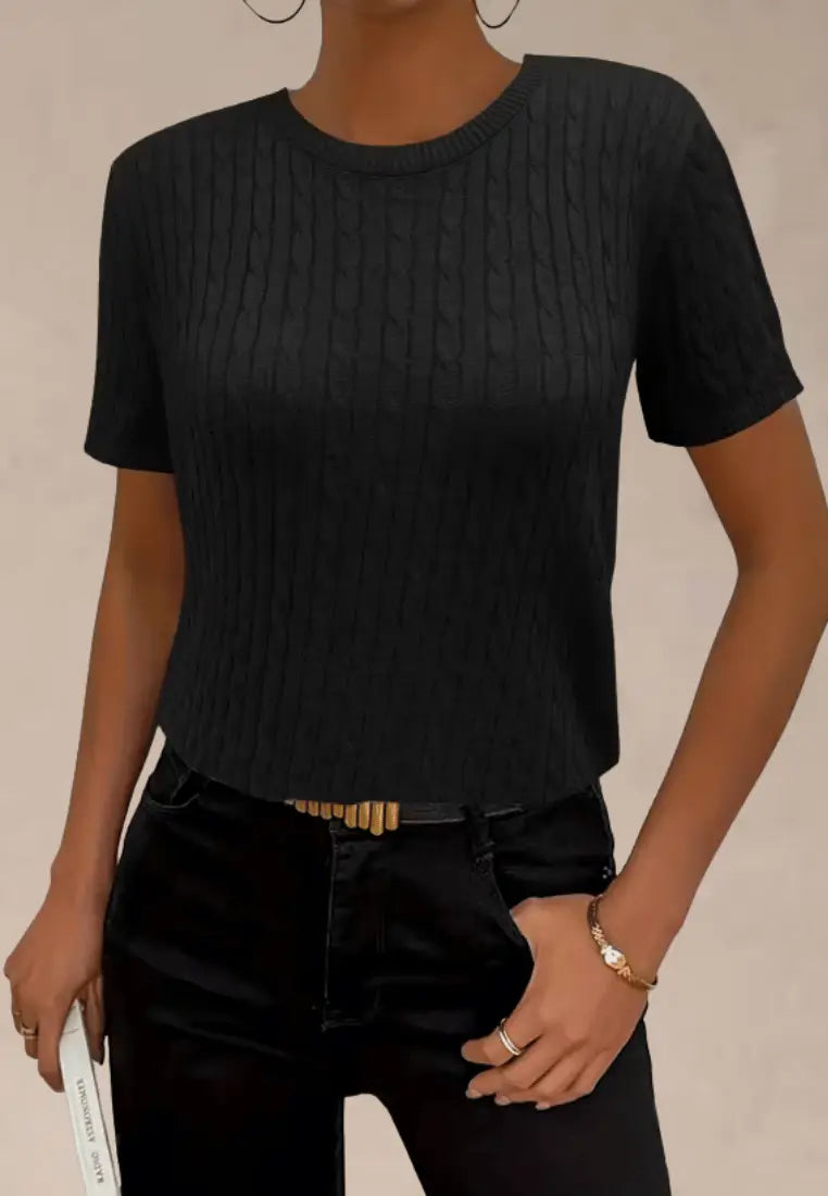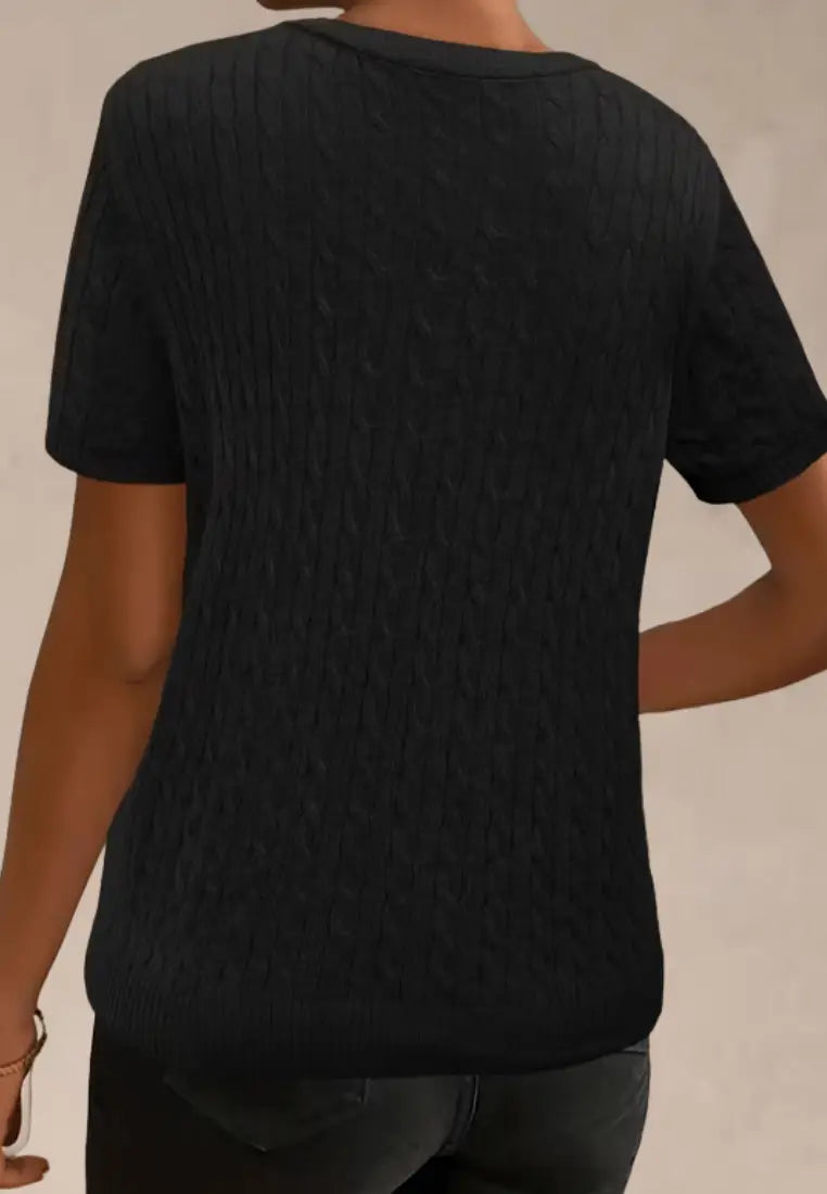 Czarny sweter damski z krótkim rękawem i okrągłym dekoltem