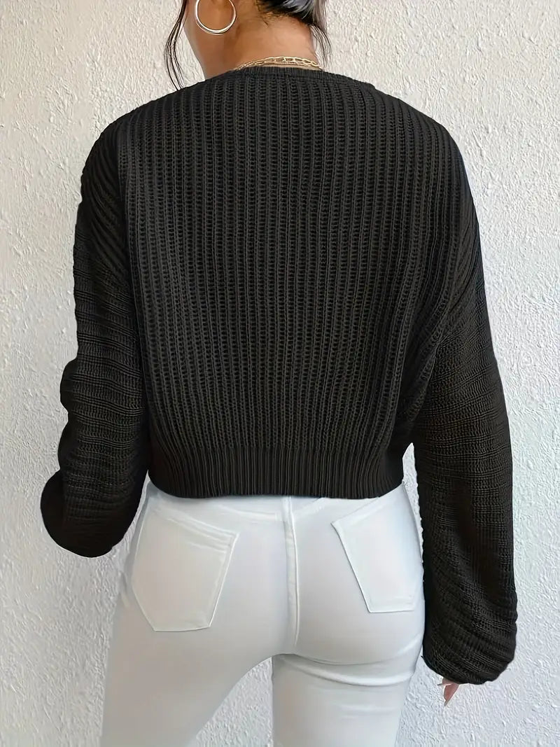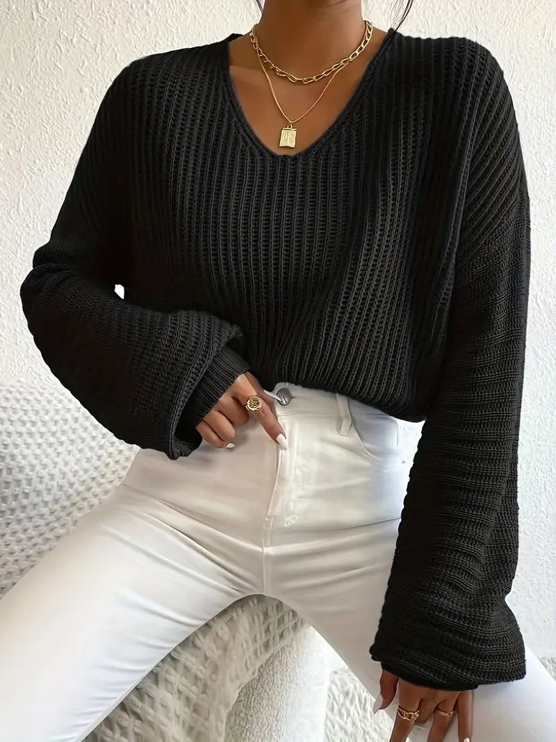 Czarny sweter prążkowany z dekoltem w serek i luźnymi rękawami
